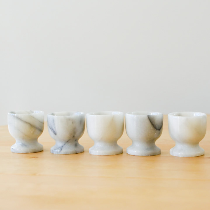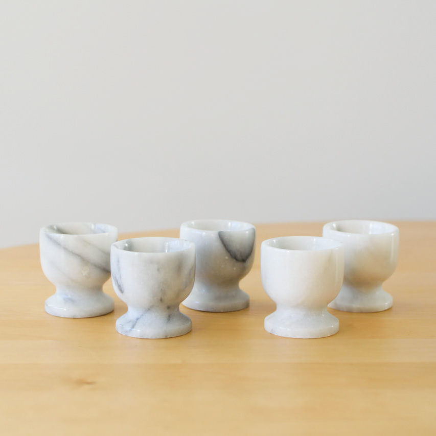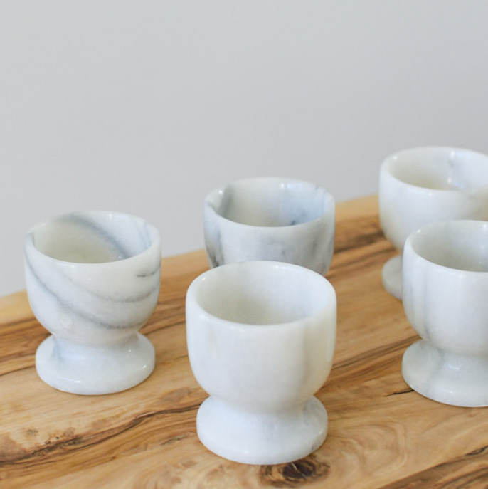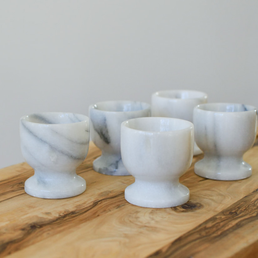 Dessa vackra äggkoppar i vit marmor är den perfekta detaljen för dig som vill addera en touch av lyx till frukostbordet. Setet innehåller sex stycken äggkoppar, där varje enskild kopp har sina unika ådringar och färgvariationer, tack vare marmorns naturliga egenskaper.