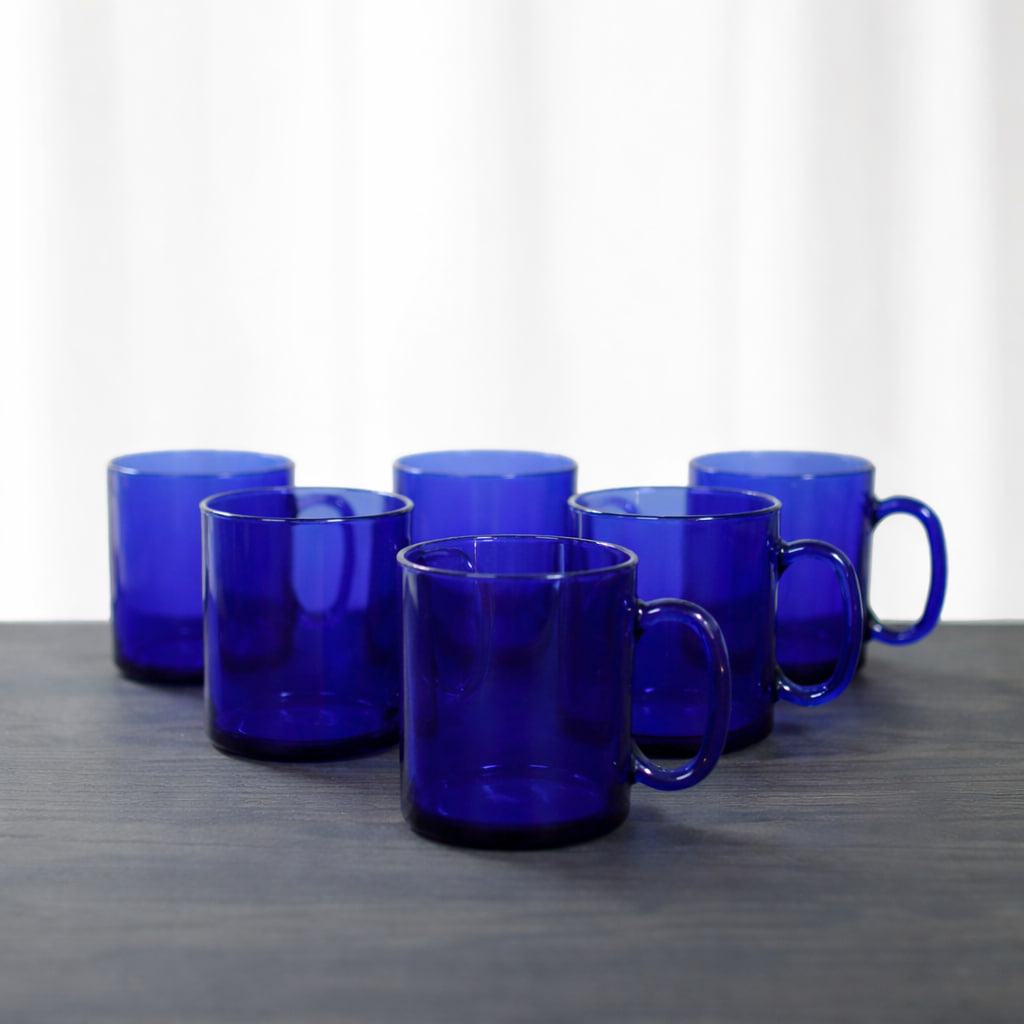 Blå glas-muggar från Arcoroc i vacker koboltblå färg. Höjd 9,5 cm, diameter 7,5 cm. Totalt 6 stycken – säljs i par. Tåligt glas i stilren retrodesign.