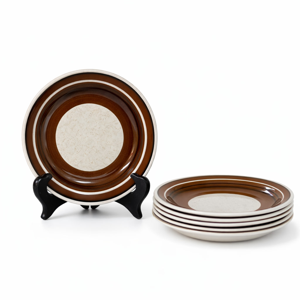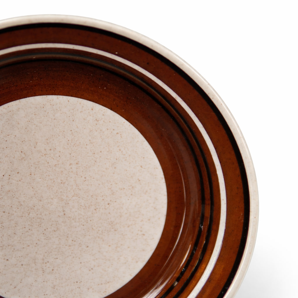 Assiett ur Isolde-serien från Rörstrand. Flintgods med bruna band och svarta ränder. Svensk 70-talsklassiker.
