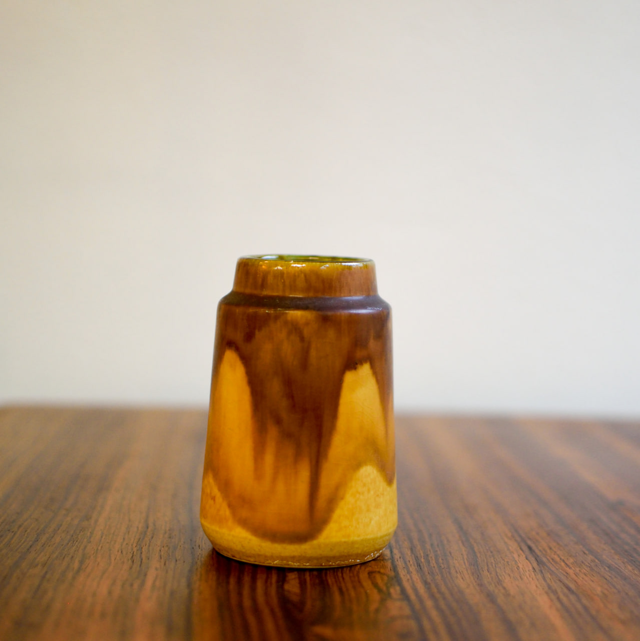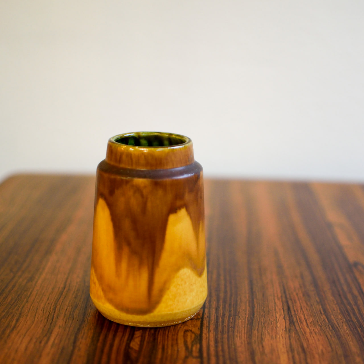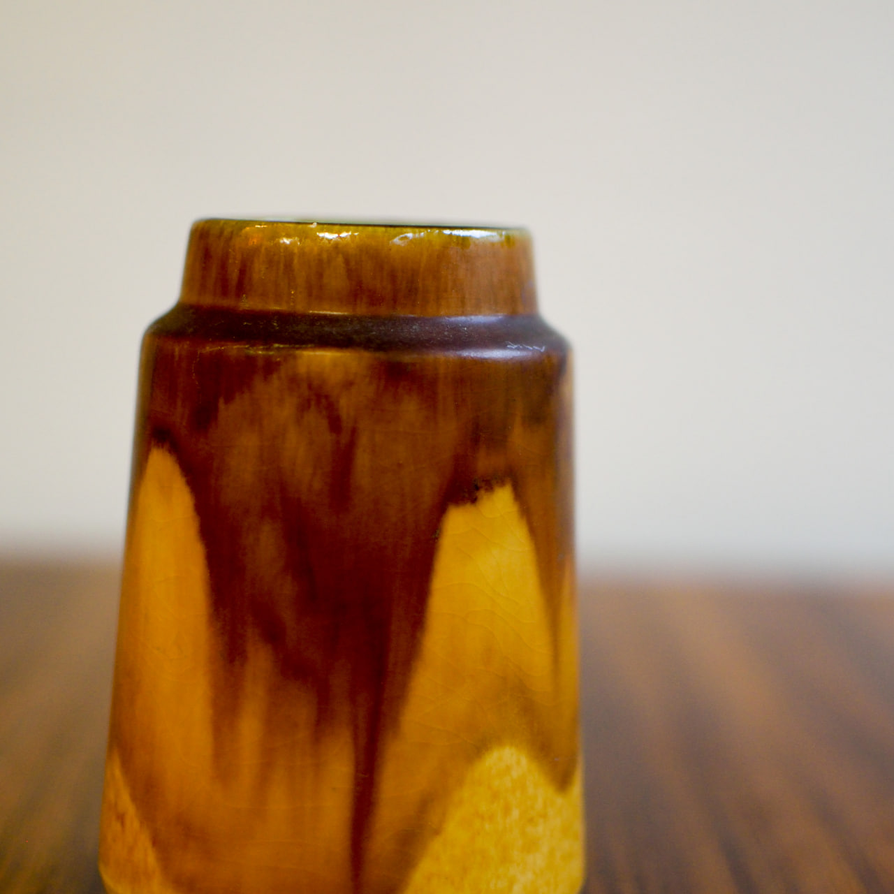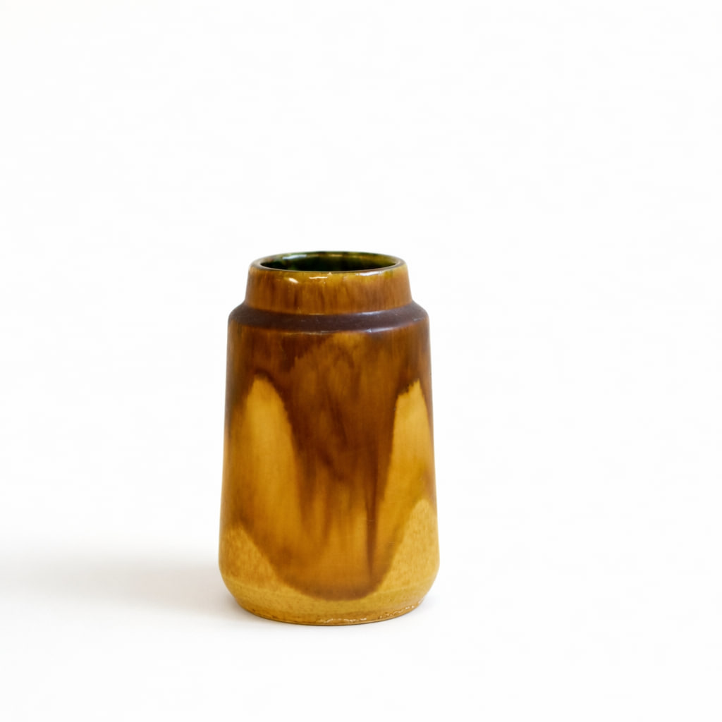 Glasyren är glansig med vackra färgövergångar i honungsgult, brunt och karamelltoner, vilket skapar en organisk och mjuk känsla. Den cylindriska formen med något insvängd hals ger ett harmoniskt och tidlöst uttryck som passar både i retro- och samtida interiörer.