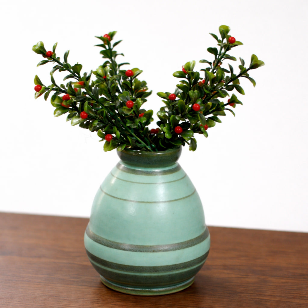 Troligtvis formgiven av Eva Jancke-Björk. Bo Fajans vas ”Turk”, turkosgrön med dekorativa ringar. Höjd 17 cm. Vacker svensk keramik.
