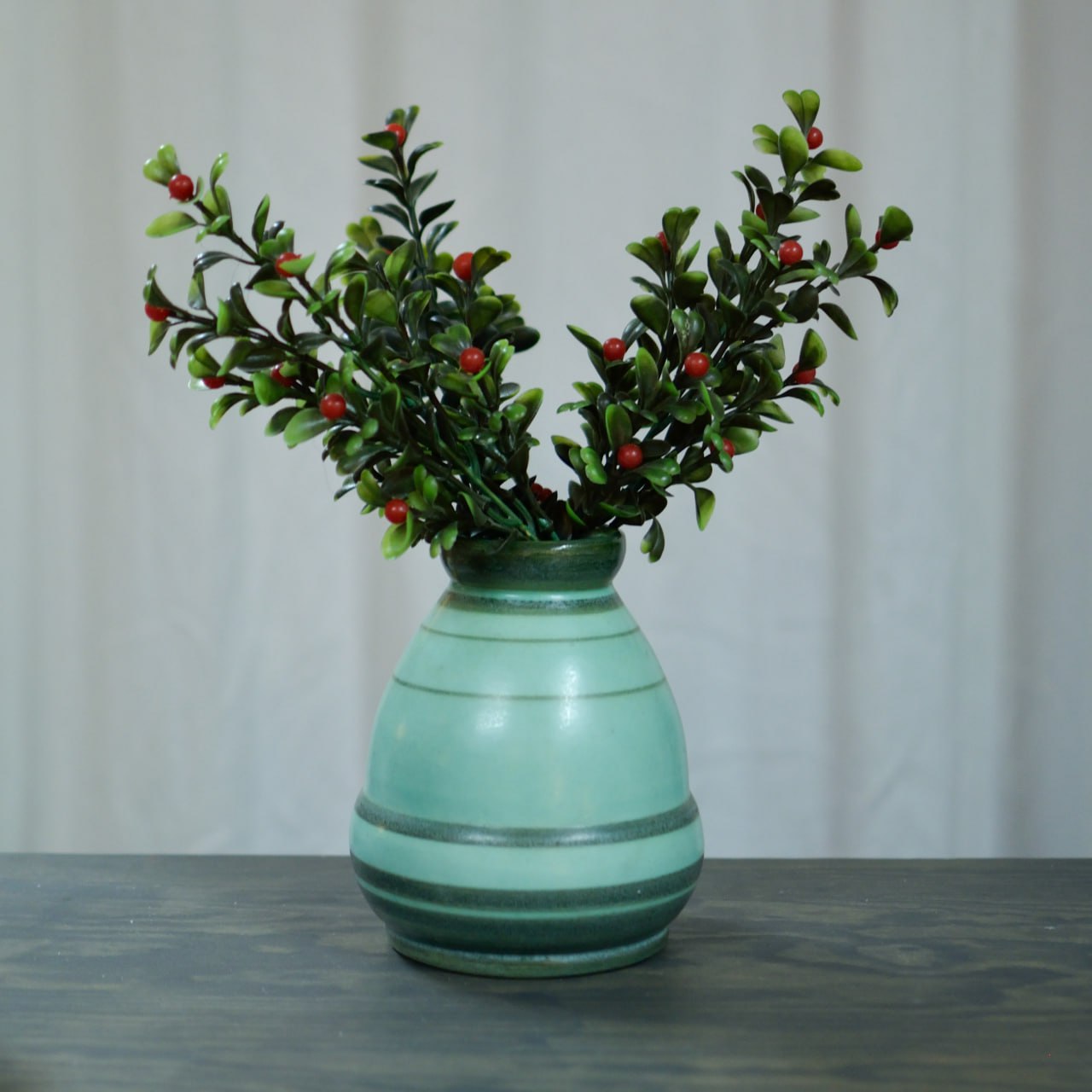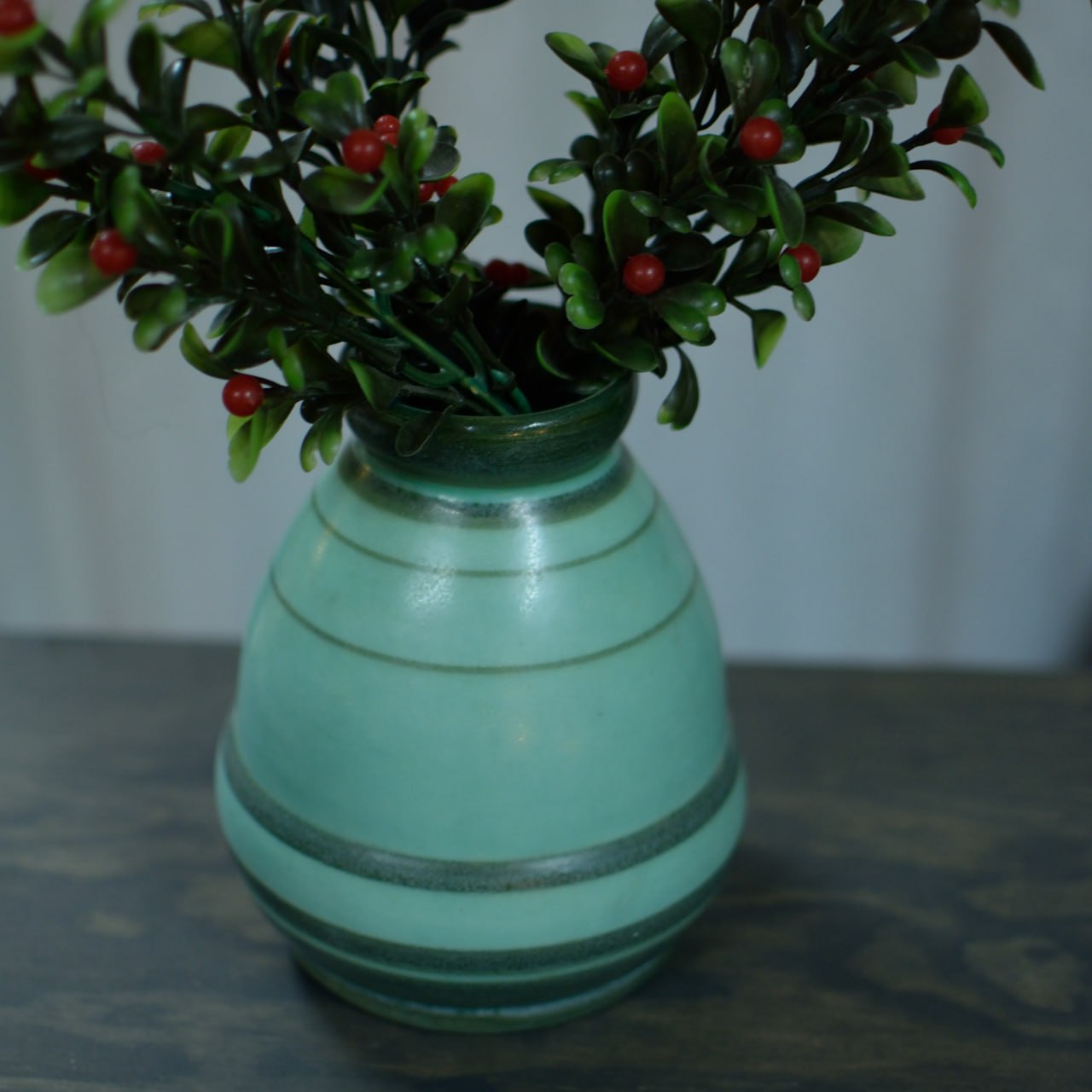 Vasen är signerad ”Turk” och har en harmonisk, rundad form med turkosgrön glasyr. De handmålade dekorativa ringarna i mörkare grön ton ger ett levande uttryck som är typiskt för både Bo Fajans och Jancke-Björks formspråk.