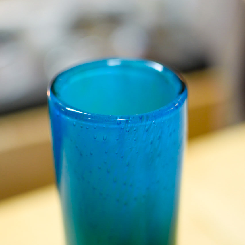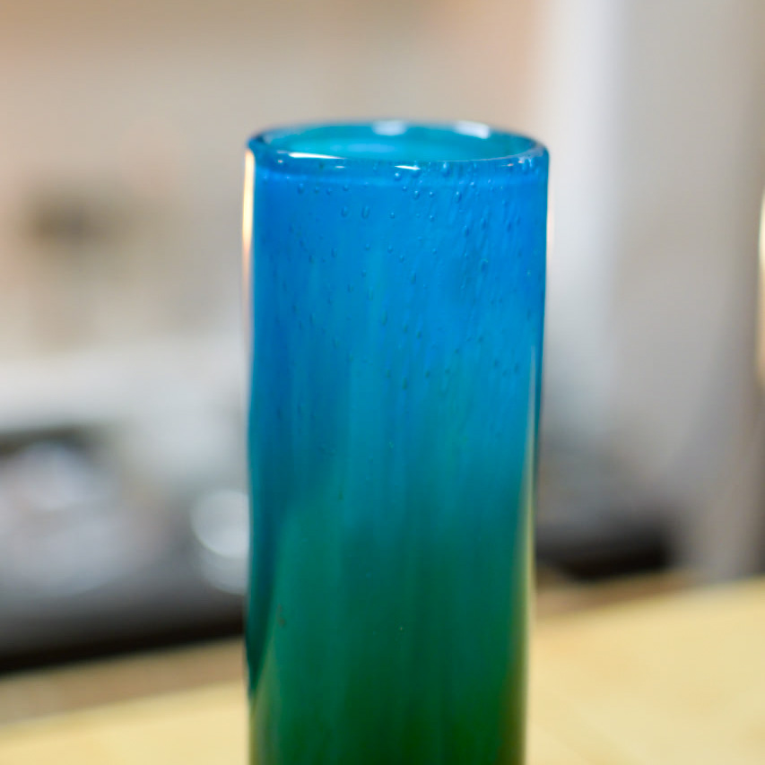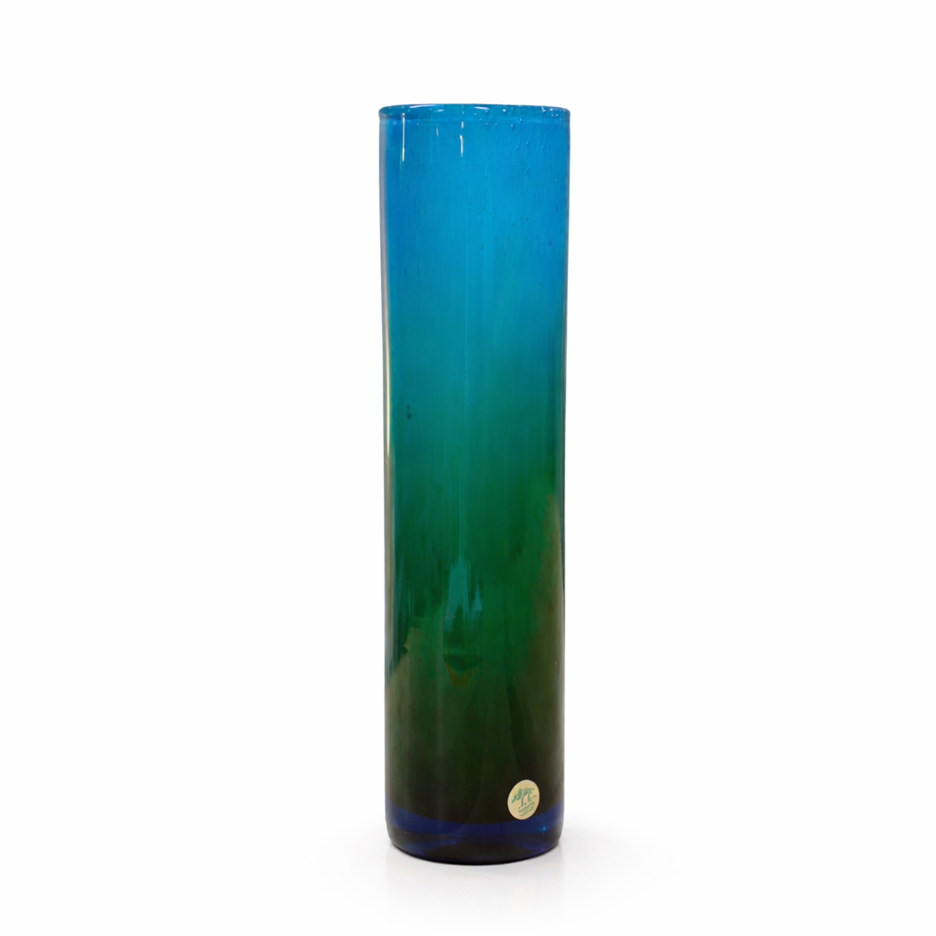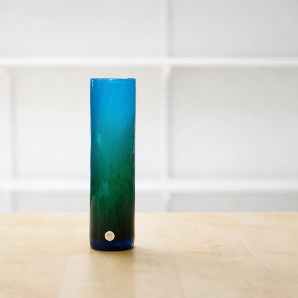 Denna munblåsta vas har en harmonisk färgövergång från djupblått till grönt, vilket skapar en vacker illusion av rörelse och djup. Den rena cylindriska formen är typisk för Lakes formspråk – en kombination av nordisk enkelhet och konstnärlig precision.