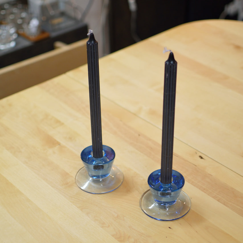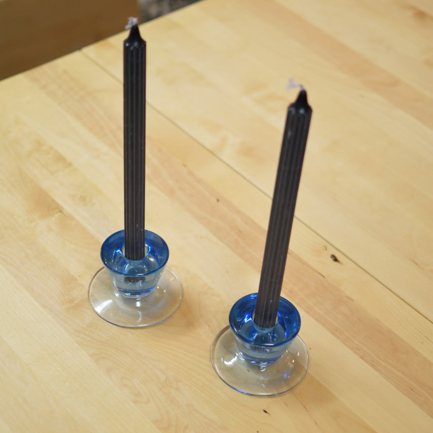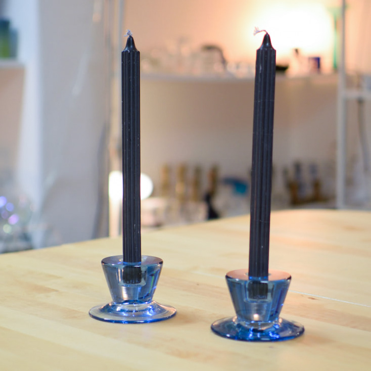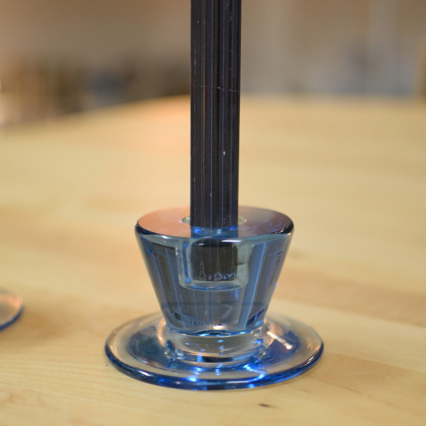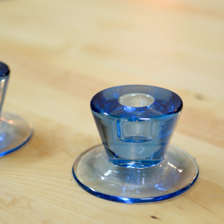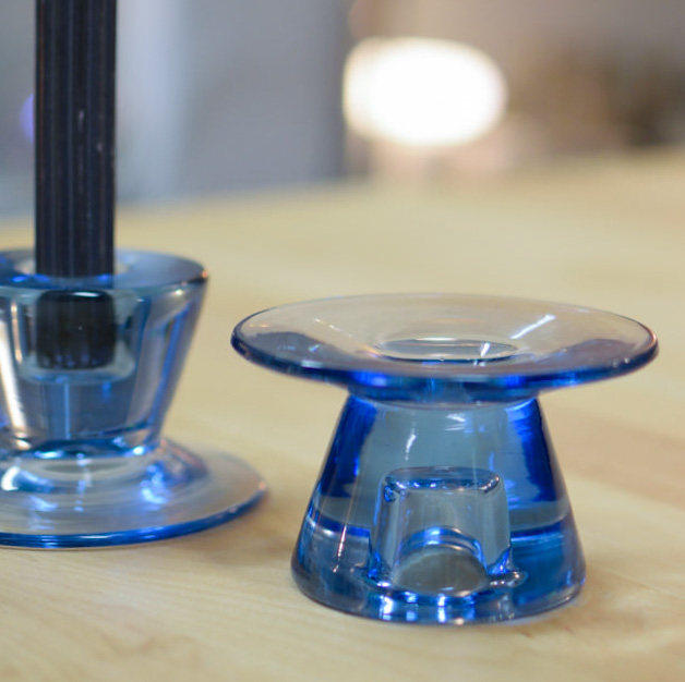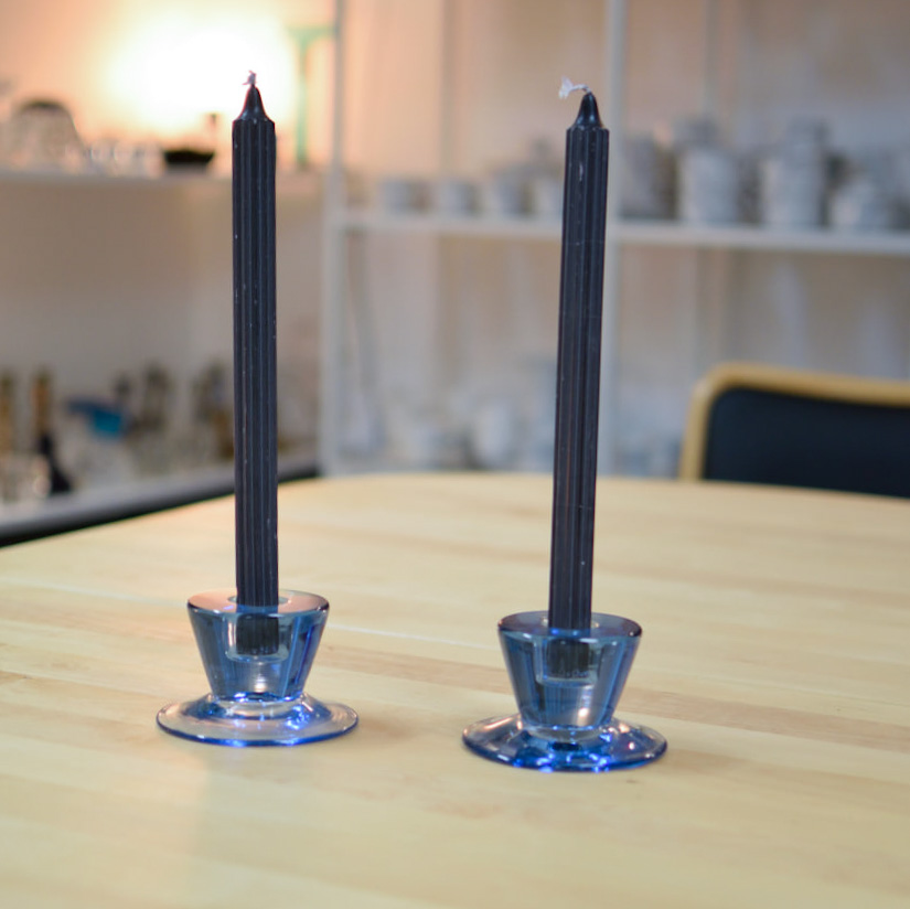 Elegant par ljusstakar i blått glas, med tidlös design som kombinerar funktion och estetik. Ljusstakarna har en smart tvåsidig utformning – ena sidan är avsedd för långa kronljus, medan den andra passar blockljus. På så sätt får du två stilar i ett och kan enkelt variera efter tillfälle och stämning.