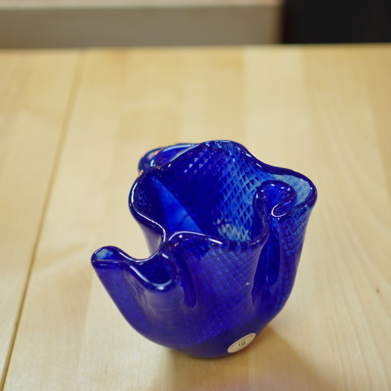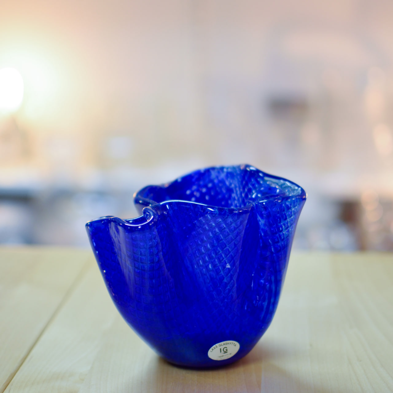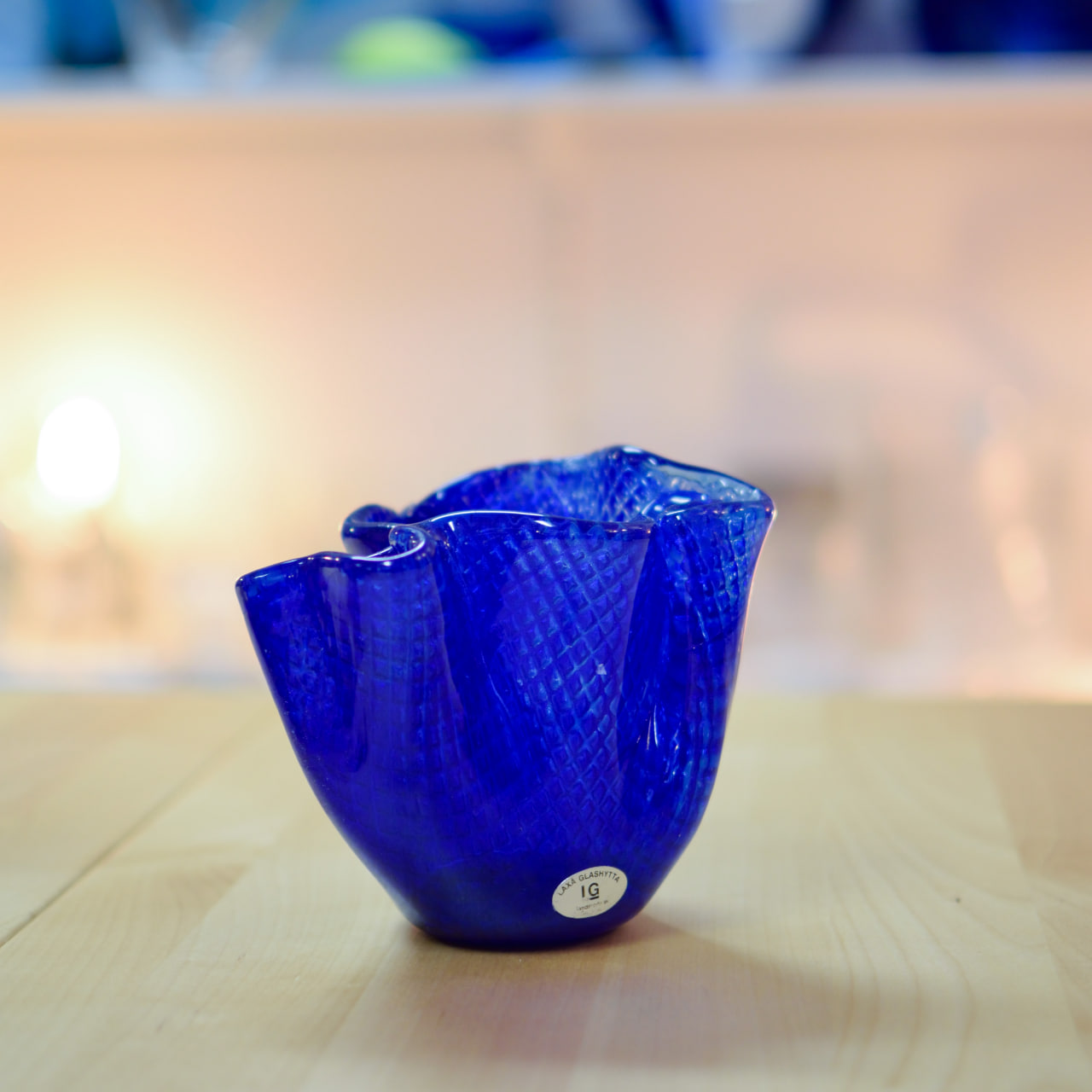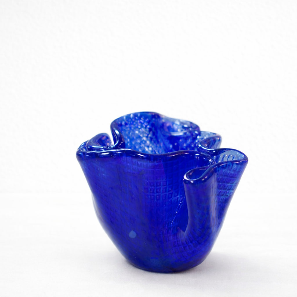 En charmig liten handblåst vas från Laxa Glashytta, tillverkad i ett intensivt koboltblått glas med vackert vågig kant och mönstrad yta. Glaset har en lätt textur som ger djup och liv åt den starka blå färgen, och formen är både organisk och elegant – som ett stilla veck av vatten fångat i glas.