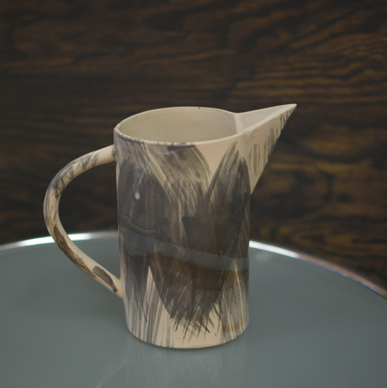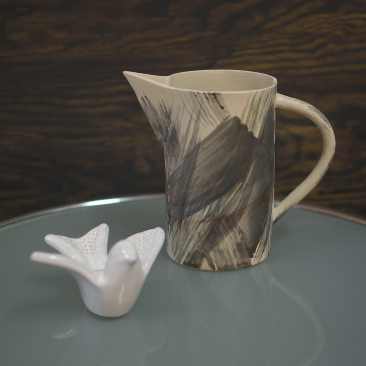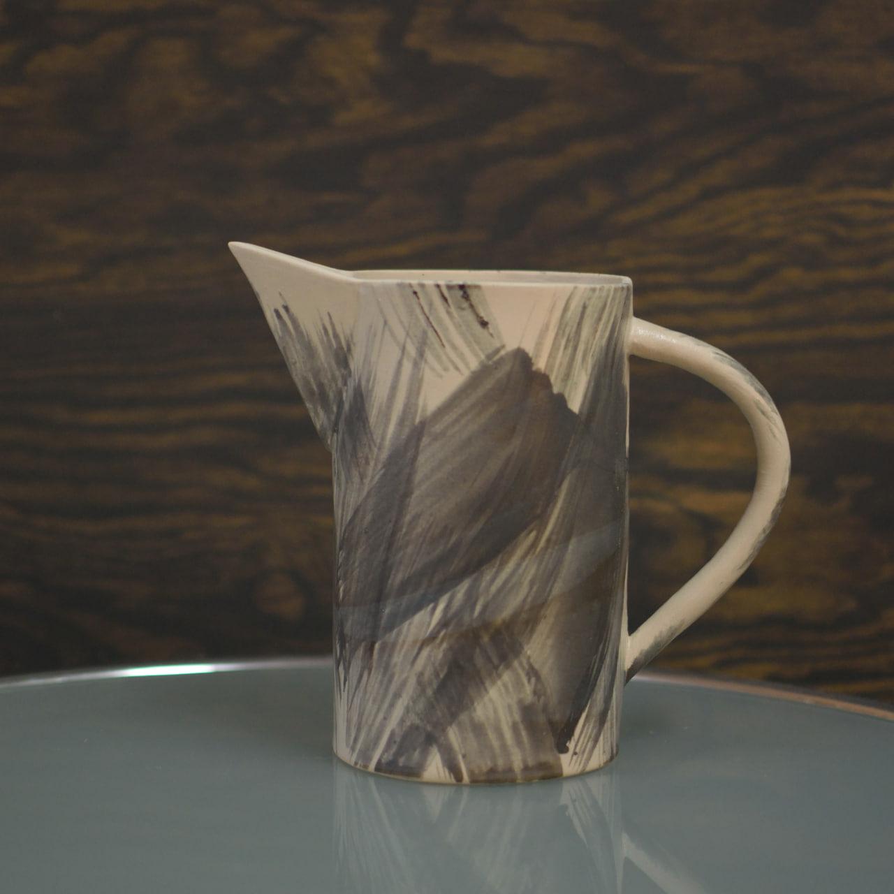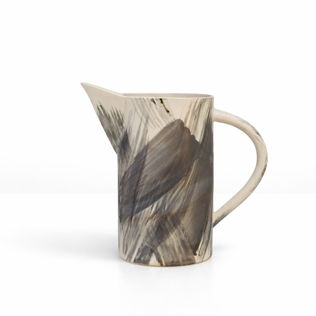 En unik handgjord kanna i keramik, skapad med konstnärlig frihet och levande penseldrag i grå och svarta toner mot en ljus bas. Den rustika glasyren och den målade ytan ger ett uttryck som känns både organiskt och modernt, med tydlig känsla av hantverk och individualitet.