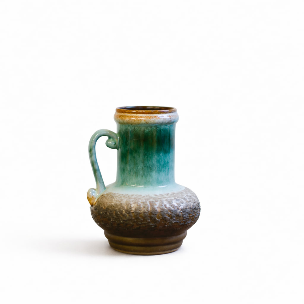 Vacker hänkelvas från Strehla Keramik, modell 9011, tillverkad i Tyskland under 1900-talet. Vasen har en harmonisk form med mjukt rundad kropp och elegant smal hals med dekorativ hänkel. Den glaserade ytan övergår från djupt mossgrön till ljus turkos och brun, med en karakteristisk bubblig struktur nertill som ger den en levande, handgjord känsla.