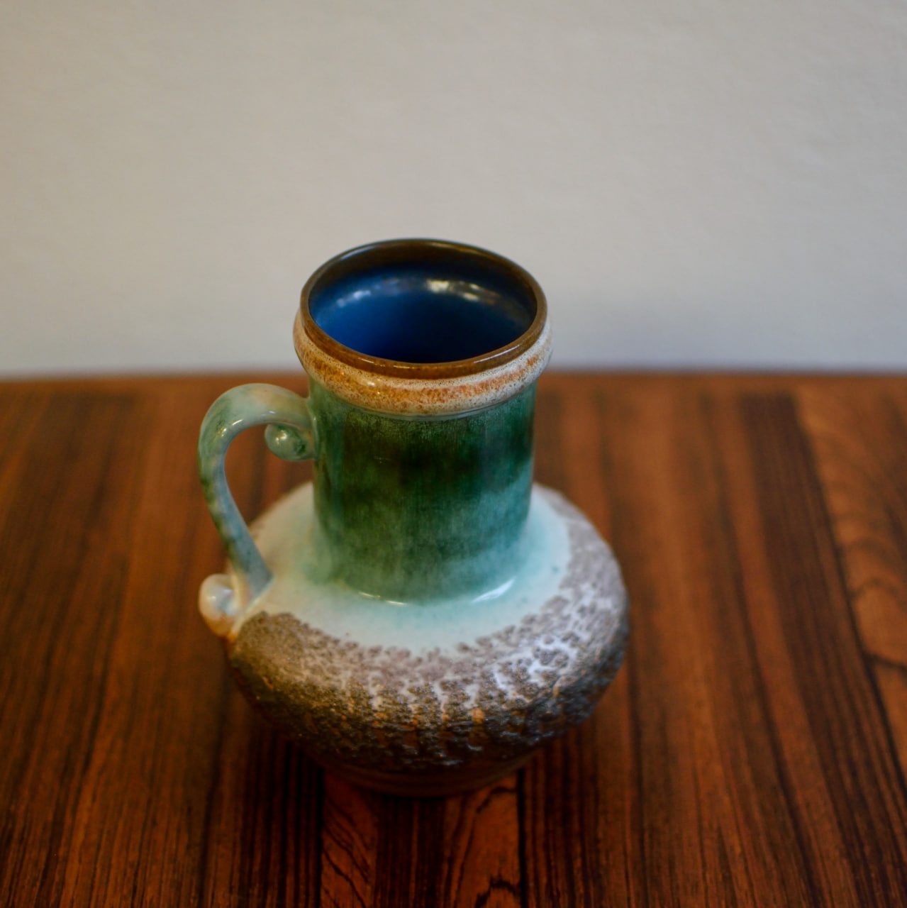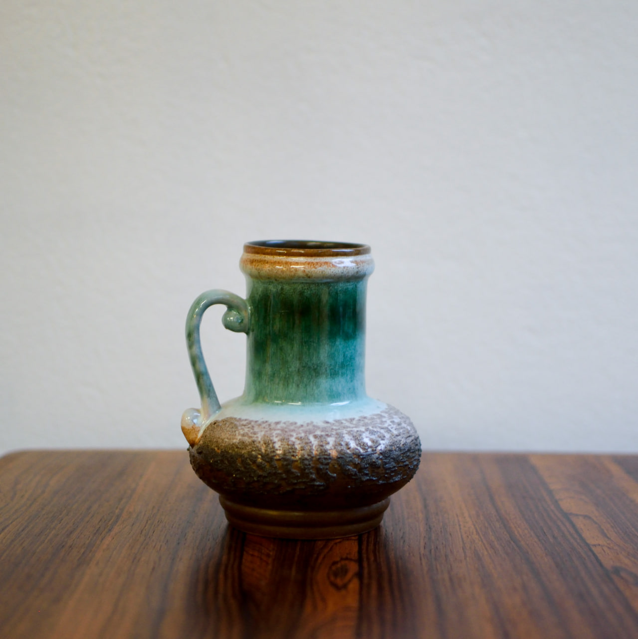 Strehla hänkelvas modell 9011. Västtysk keramik i grönt, turkost och brunt. Höjd ca 16 cm.