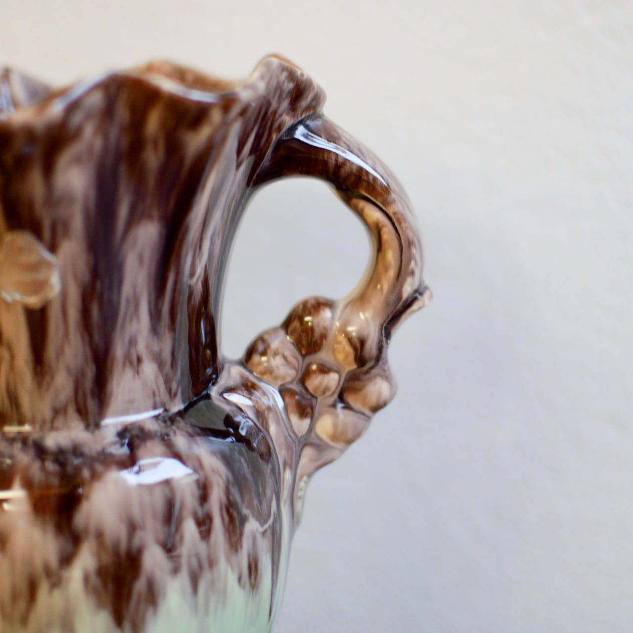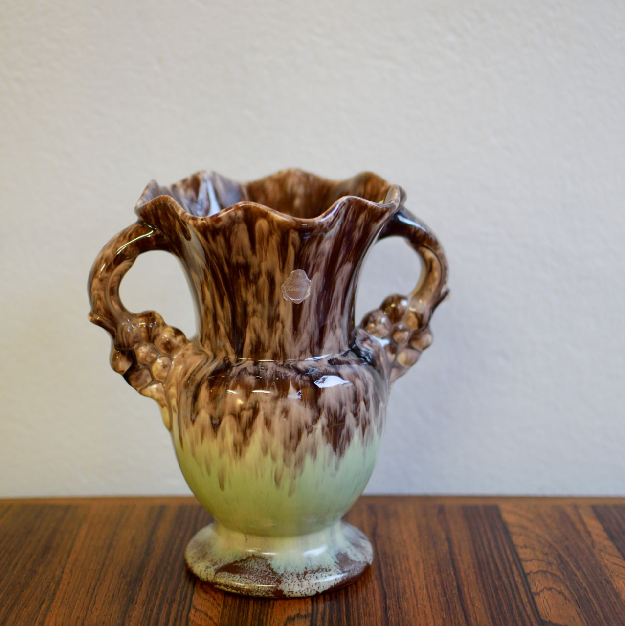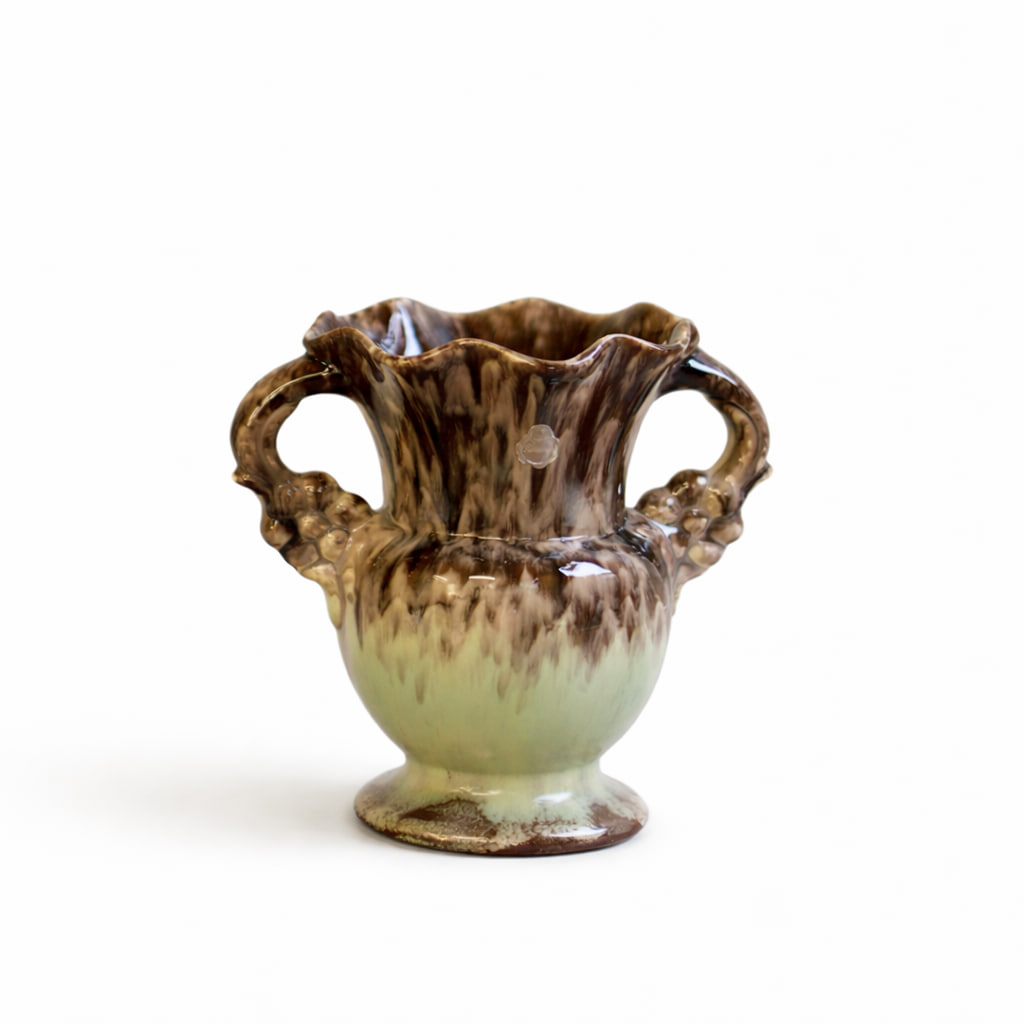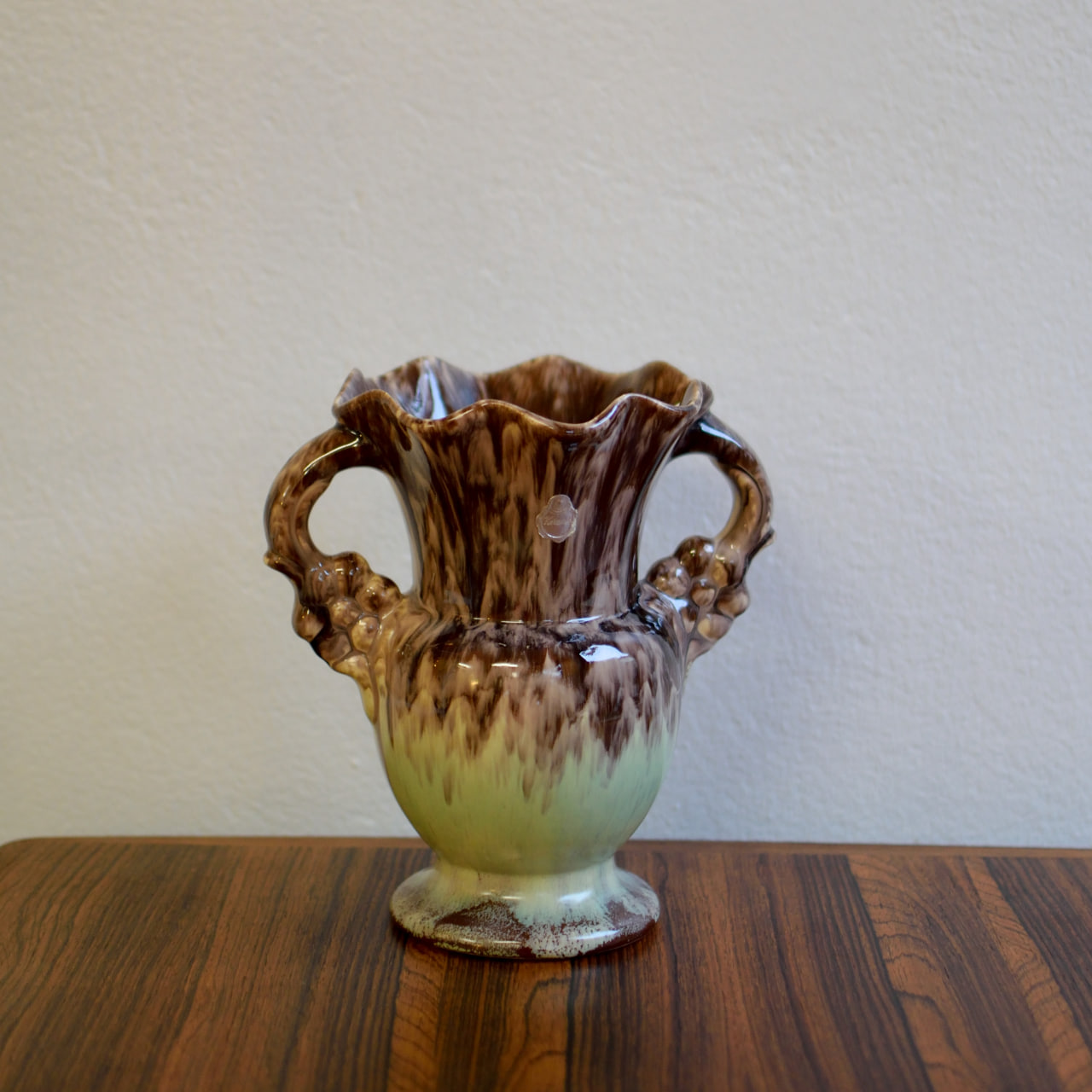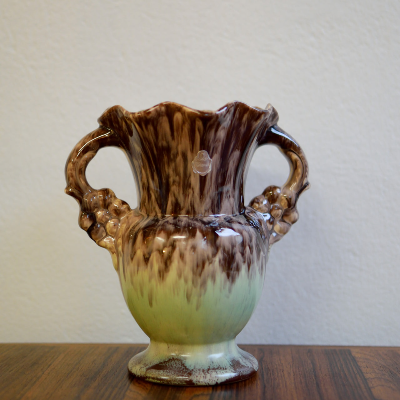 Vasen har en klassisk trophy-form med två dekorativa hänklar i barockinspirerad stil. Glasyren är ett konstnärligt exempel på den populära drip glaze-tekniken, där en rik chokladbrun glasyr rinner ner över en bas i havsskumgrönt med inslag av varmt orange. Resultatet är ett levande färgspel med djup och karaktär – typiskt för Ü-Keramiks produktion under 50- och 60-talen.