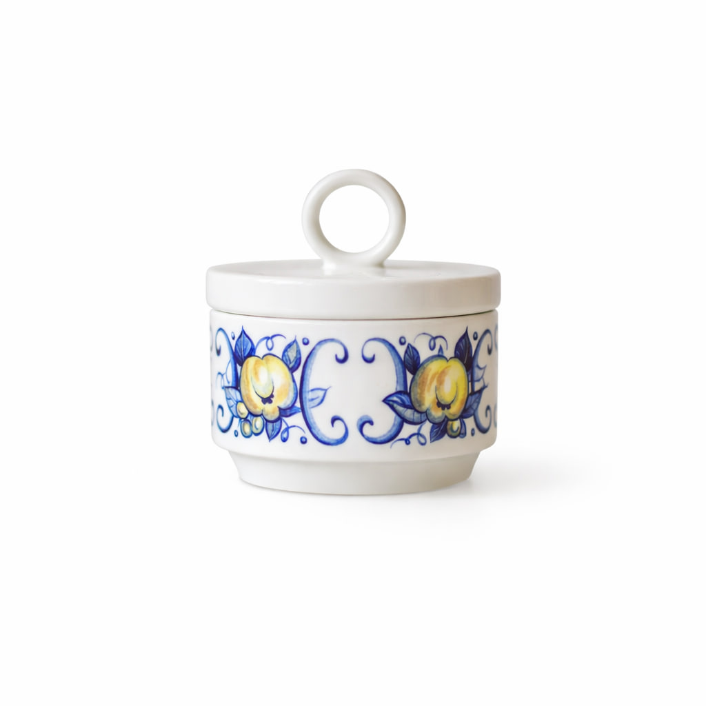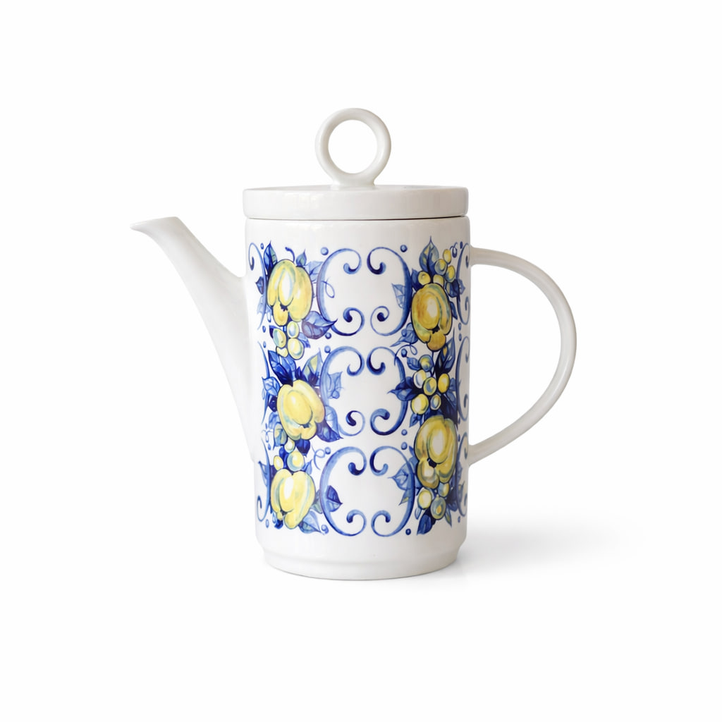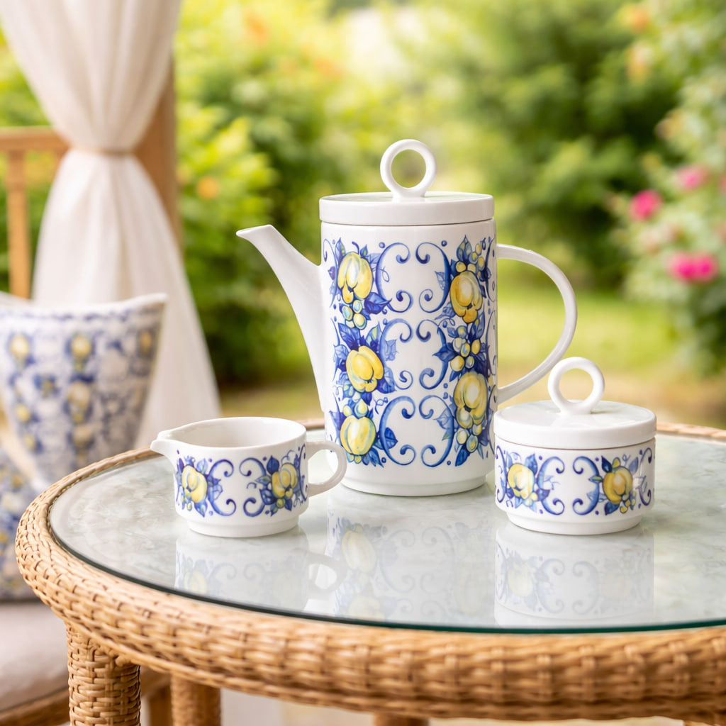 Färgstarkt och charmigt kaffeset ur den ikoniska serien ”Cadiz” från Villeroy & Boch, tillverkad i Luxemburg mellan ca 1970–1984. Setet består av en hög serveringskanna med lock, en mjölkkanna och en sockerskål med lock – alla tre i matchande blå-gult frukt- och bladmotiv med tydliga sydeuropeiska influenser.