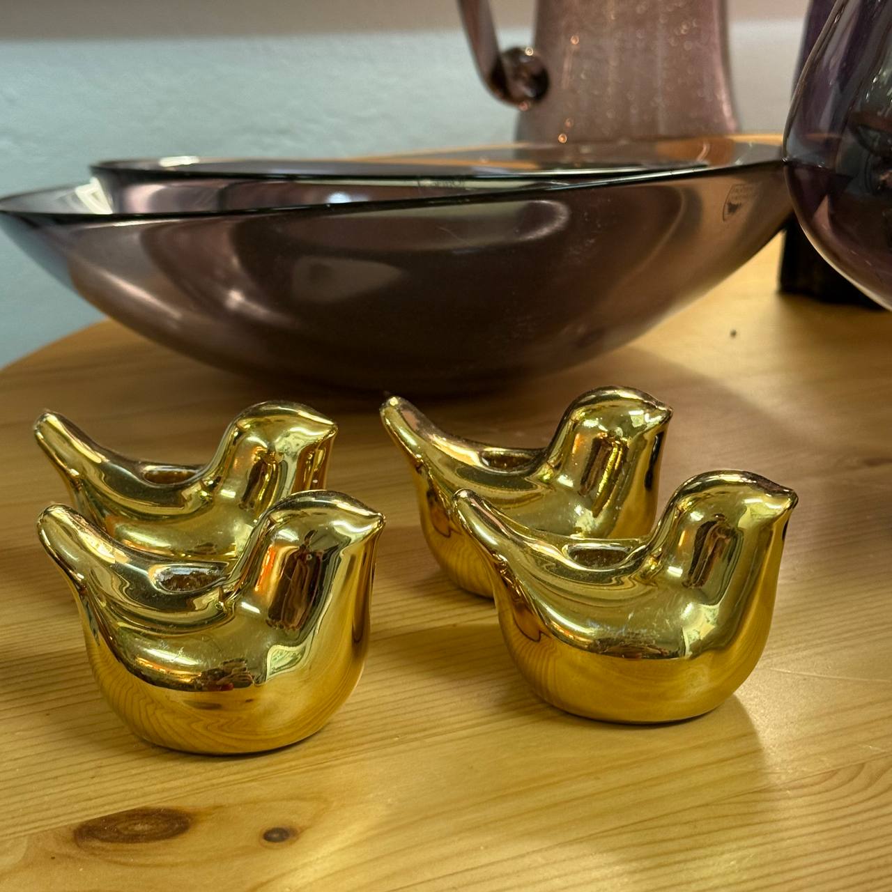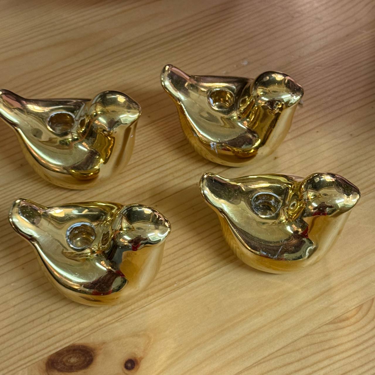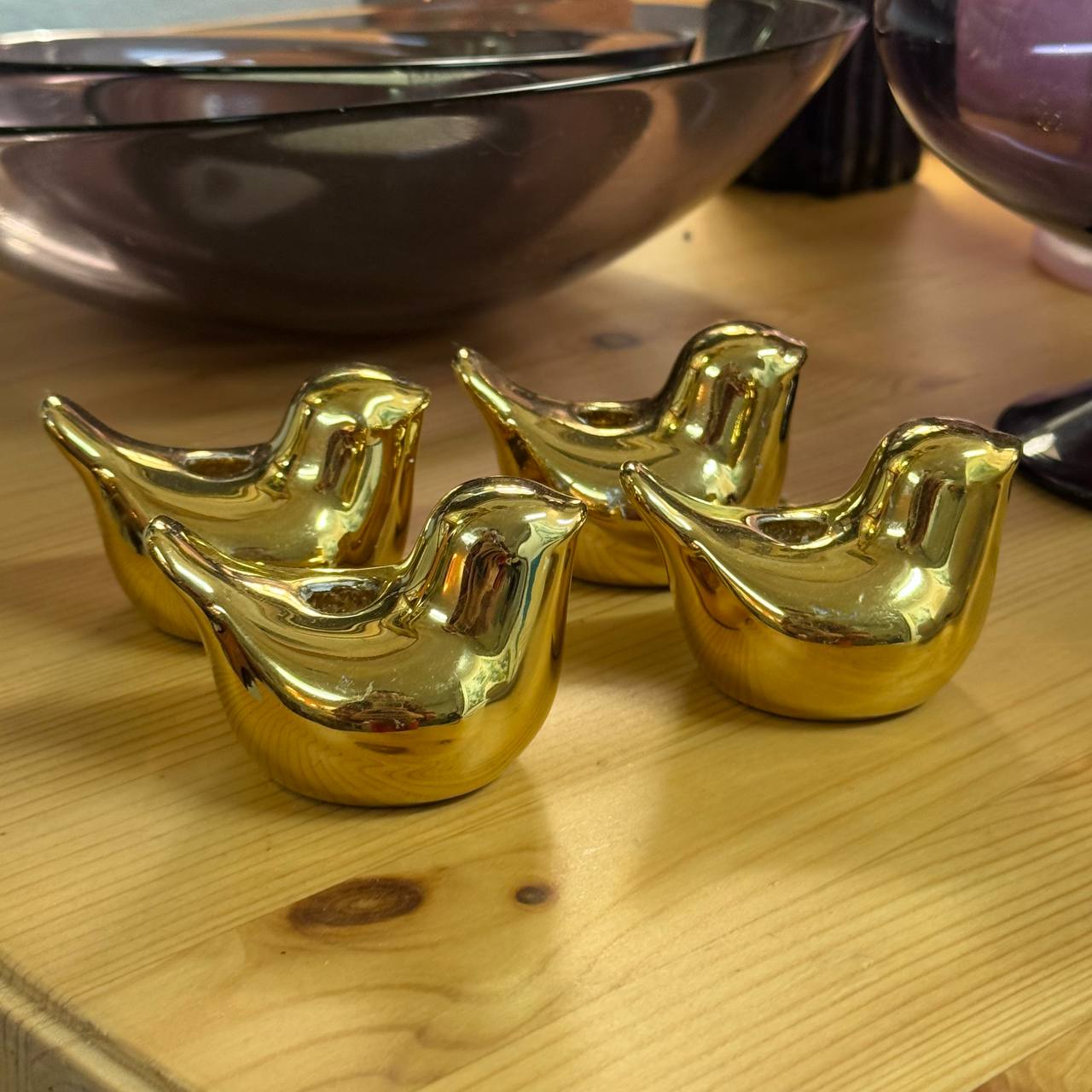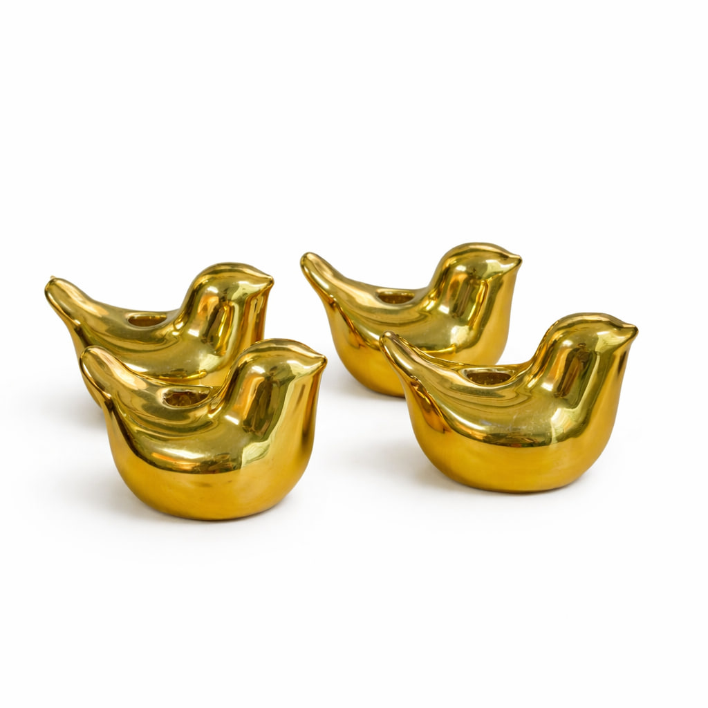 Ett dekorativt och charmigt set med fyra ljusstakar formade som små fåglar i en elegant, gyllene finish. Ljusstakarna är tillverkade i keramik med högblank guldfärgad glasyr, vilket ger dem ett lyxigt och lekfullt uttryck.