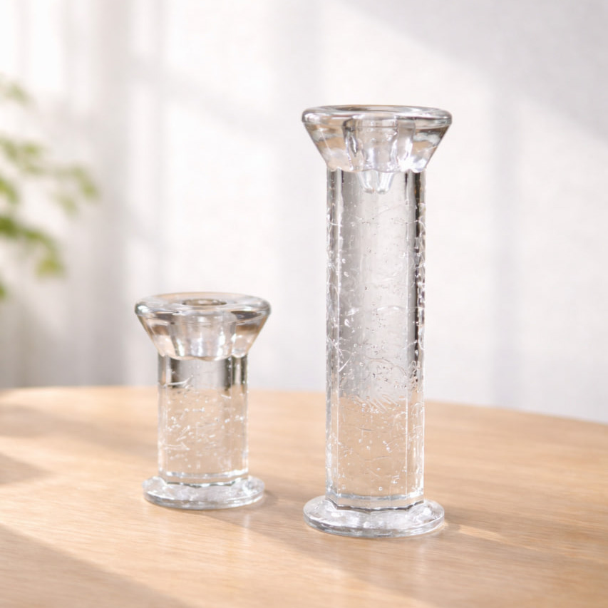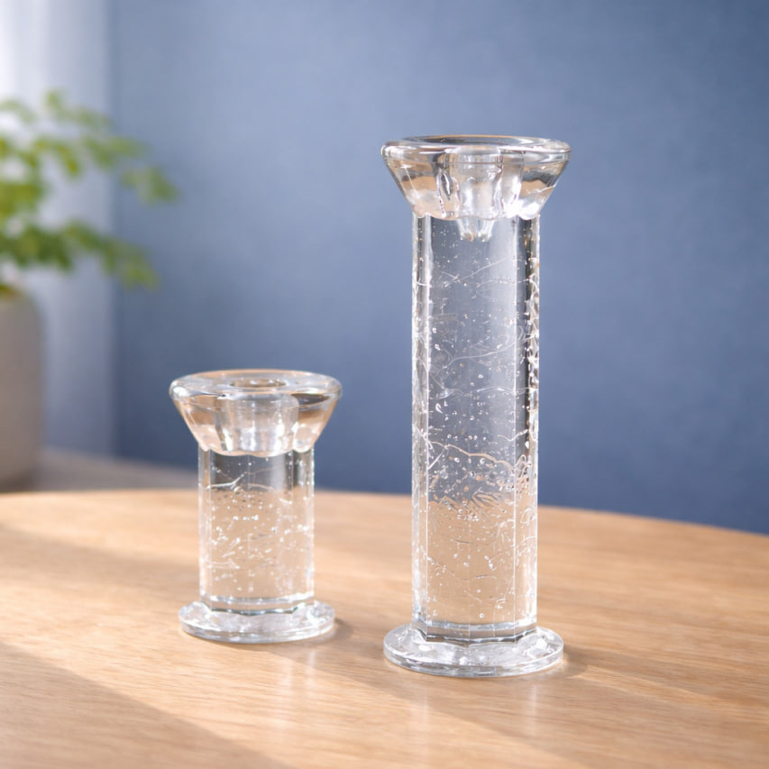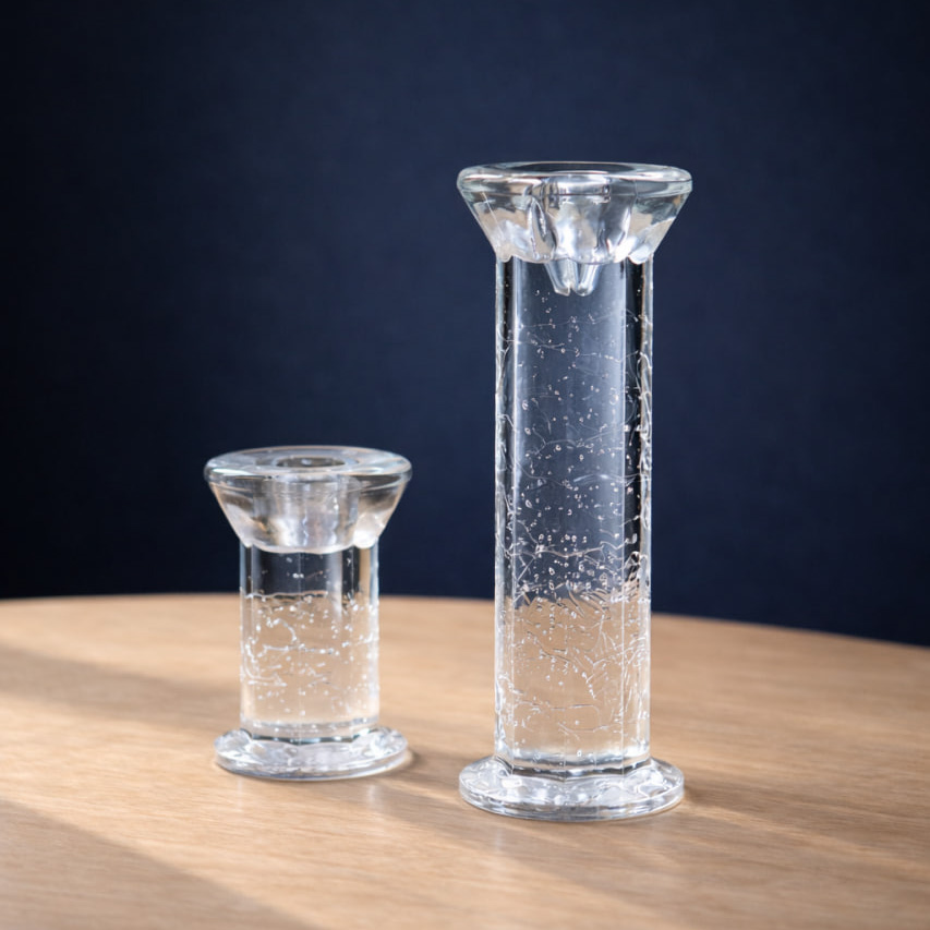 Ett par stilrena ljusstakar i klart glas, formgivna av Christer Sjögren för Lindshammars glasbruk. De två storlekarna – 10 cm och 18 cm – ger ett vackert harmoniskt uttryck när de placeras tillsammans, men varje ljusstake fungerar också som ett självständigt dekorationsobjekt.