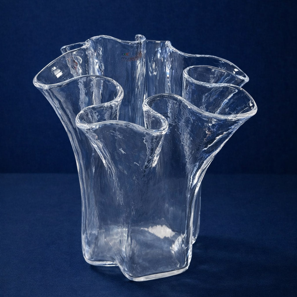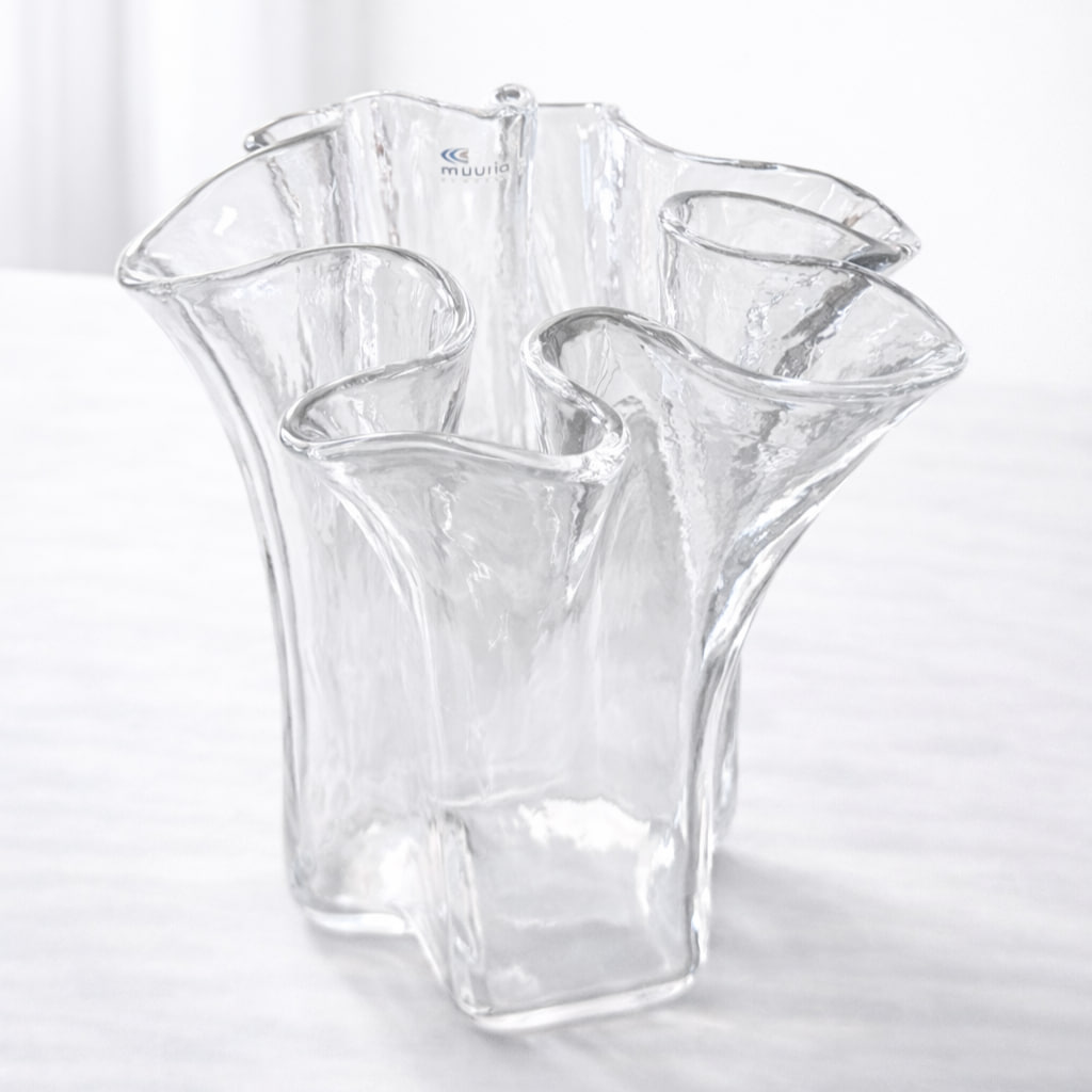 Dekorativ tulpanvas i glas från Muurla, formgiven med mjukt böljande kanter som skapar en blomliknande siluett. Vasens organiska form gör den särskilt lämpad för tulpaner och andra mjuka buketter, där blommorna får stöd samtidigt som de breder ut sig naturligt.