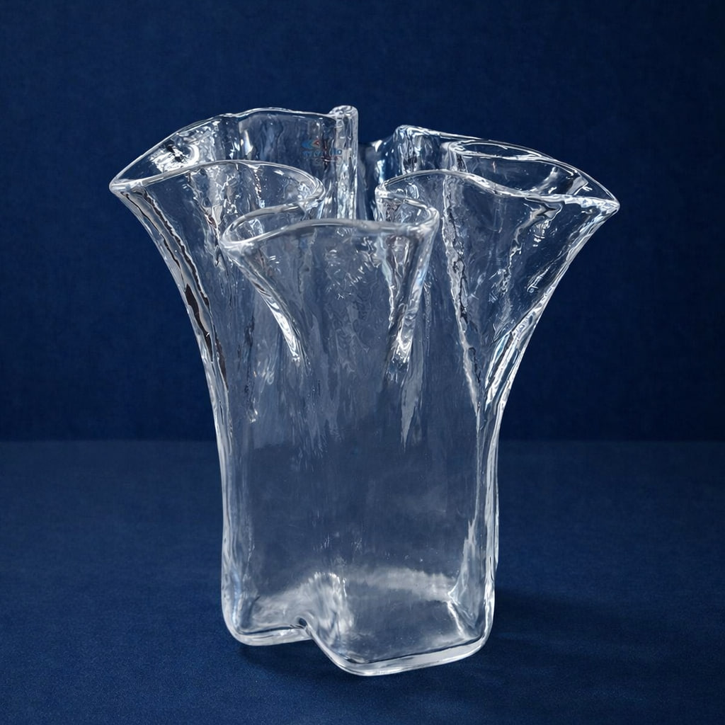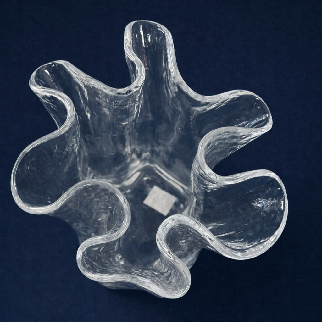 Det klara glaset har en levande struktur som fångar ljuset och ger ett elegant, nästan isliknande uttryck. Formen är både lekfull och stilren – typisk för nordisk glasdesign där funktion möter estetik.