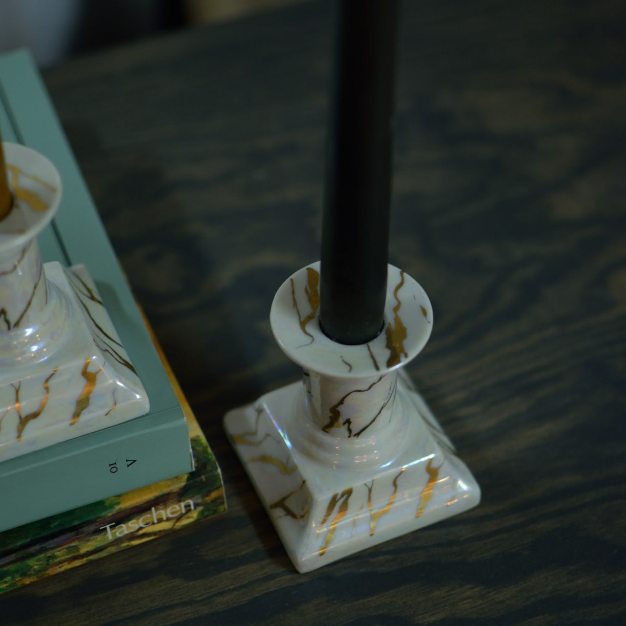 Ett charmigt par vintage ljusstakar i porslin, vackert glaserade i en vit ton med marmorerad dekor i guld och beige. Ljusstakarna har en klassisk, fyrkantig fot som ger stabilitet, och en cylindrisk överdel som smalnar av mot ljushållaren. Den skimrande glasyren tillsammans med det marmorerade mönstret ger ett elegant och dekorativt uttryck, perfekt för både moderna och traditionella hem.
