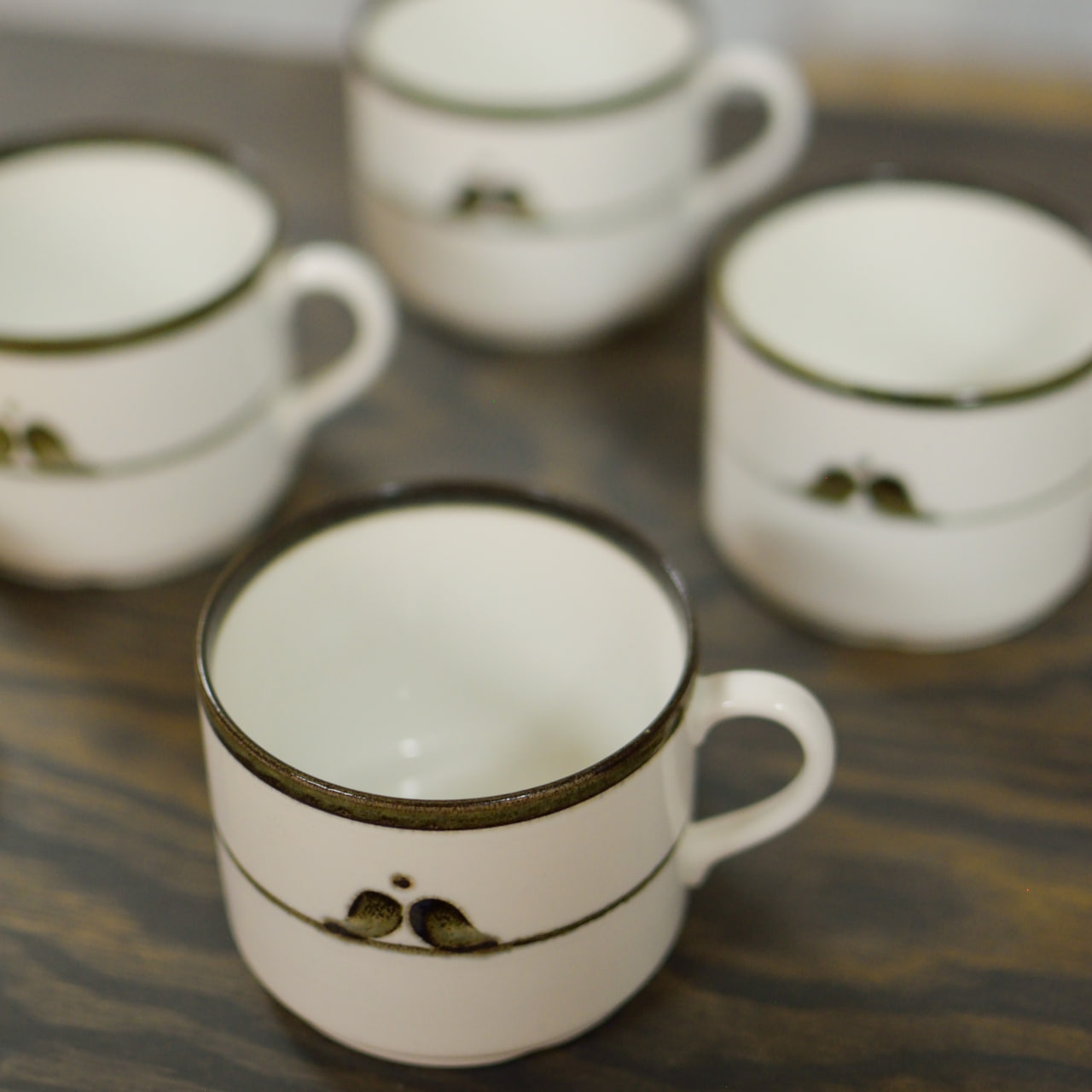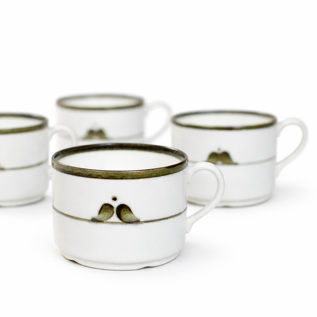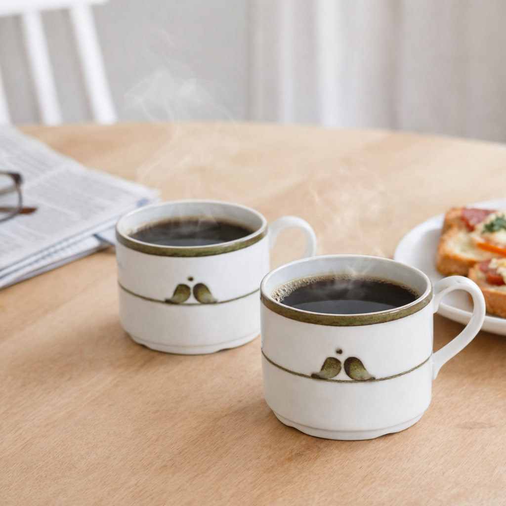 Kopparna är gjorda i vitt porslin med subtila gröna detaljer som ger en naturlig och stillsam känsla i dukningen. De säljs styckvis, vilket gör det enkelt att komplettera en befintlig servis eller bygga upp en egen.