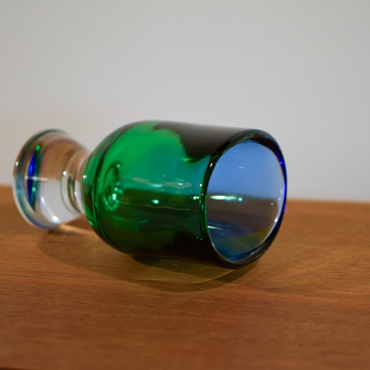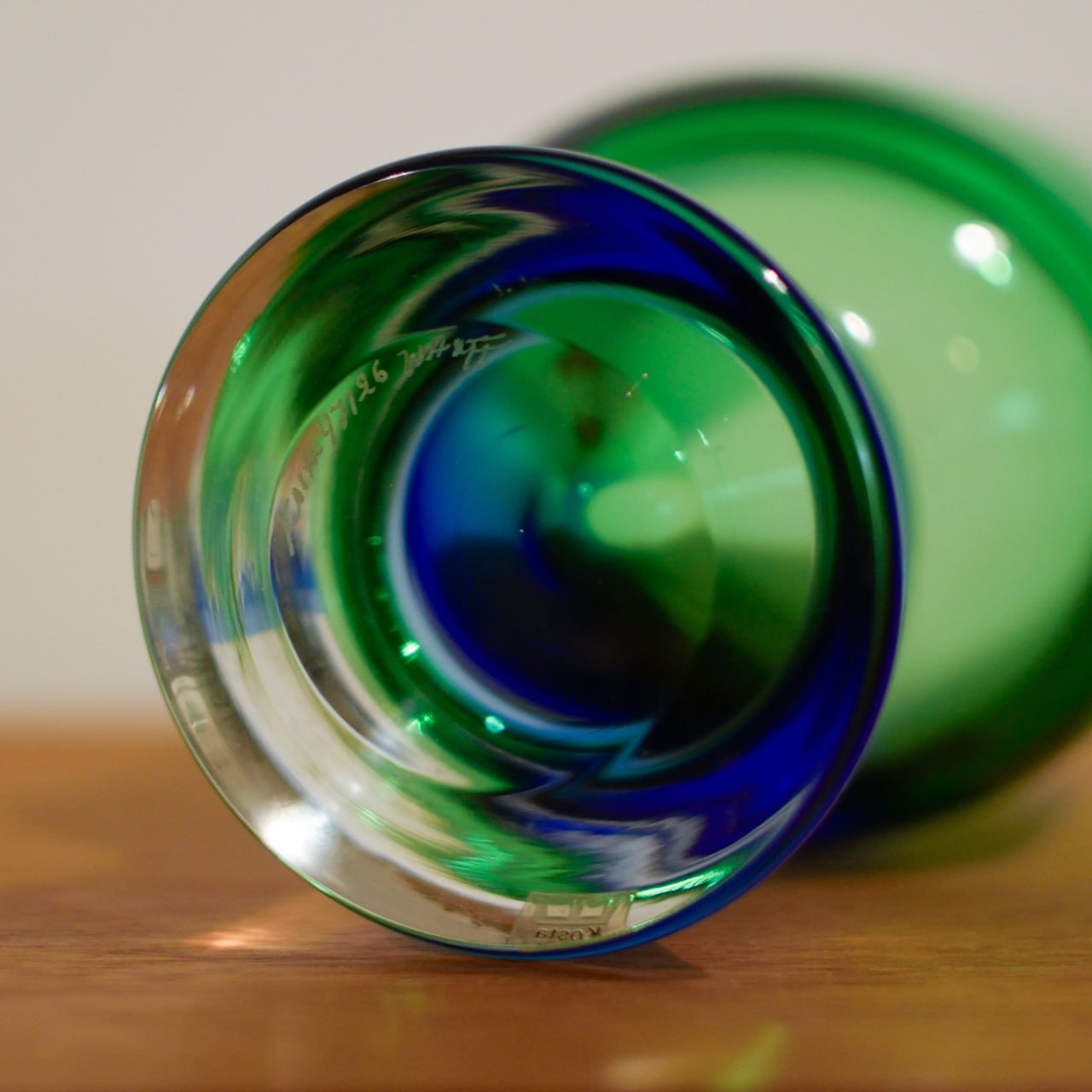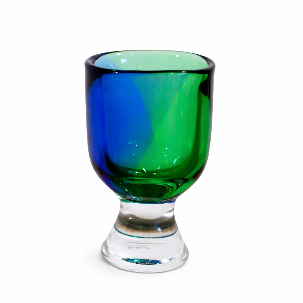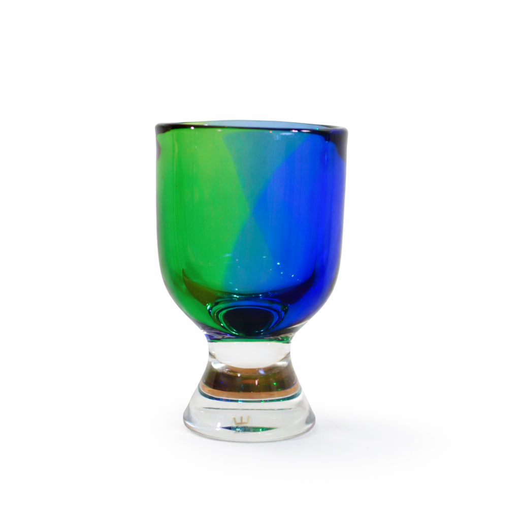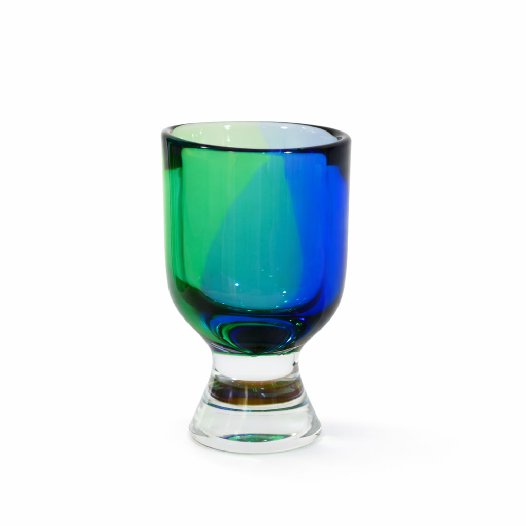 Vasen är 20 cm hög och uppbyggd i kraftiga lager av färgat och klart glas, där de djupa tonerna av blått och grönt flyter samman i ett hypnotiskt färgspel. Ljuset bryts genom massan och skapar ett inre skimmer som gör varje exemplar unikt – en genuin demonstration av Wärffs förmåga att få glaset att kännas levande.