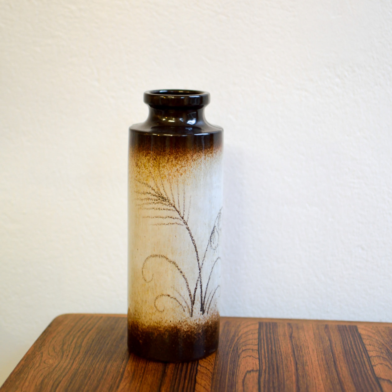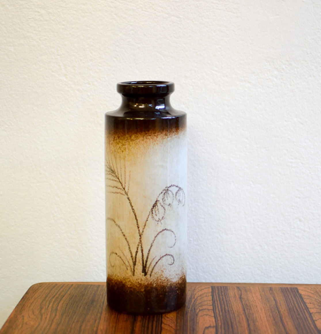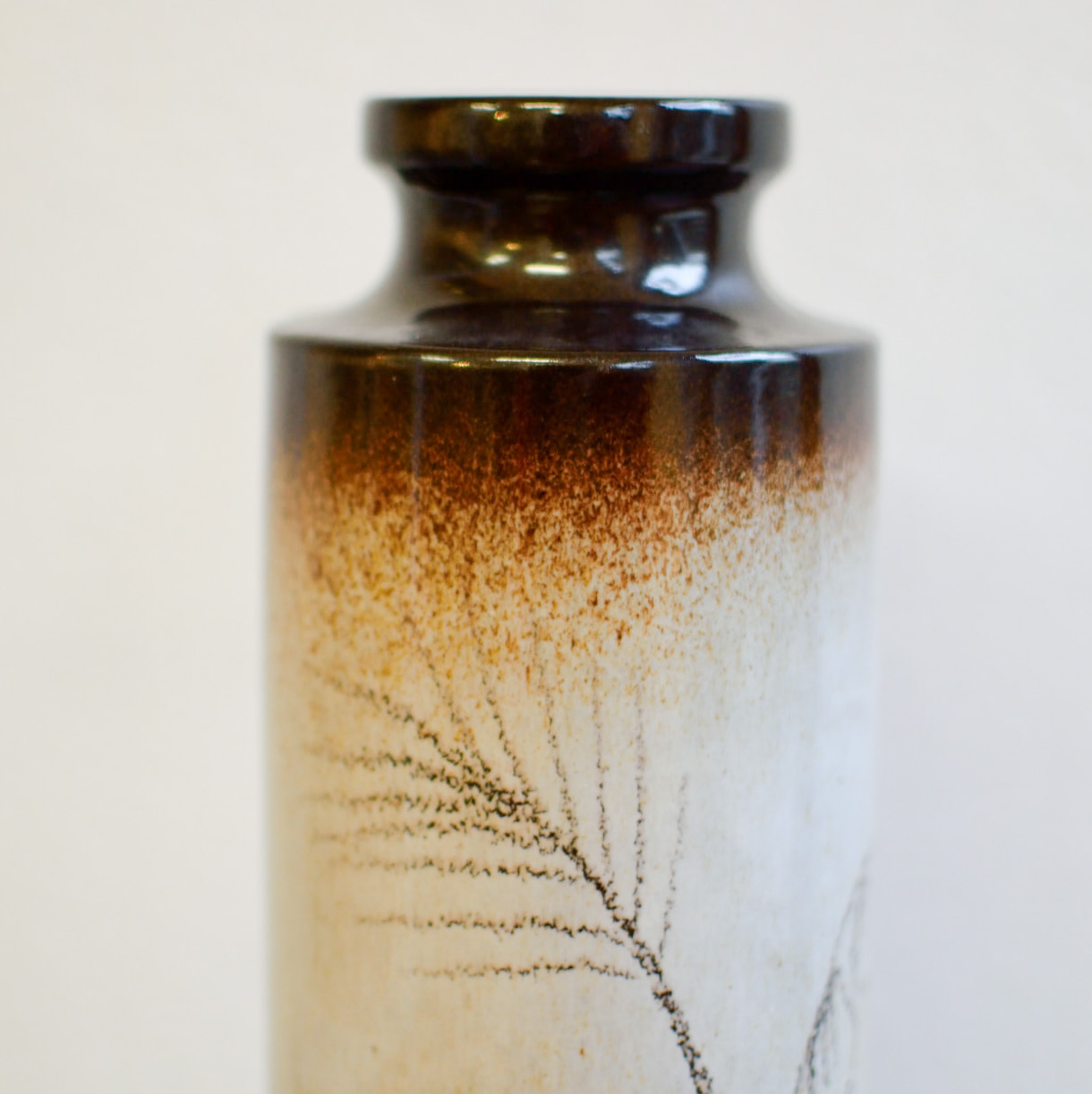 Elegant keramikvas från Scheurich, märkt 203-26 W. Germany. Vasen har en klassisk cylindrisk form med smal hals och lätt utställd kant. Den vackra glasyren övergår från mörkbrun upptill till en mjuk beige ton nedtill, med ett subtilt växtmotiv i bruna linjer som ger en naturlig, harmonisk känsla.