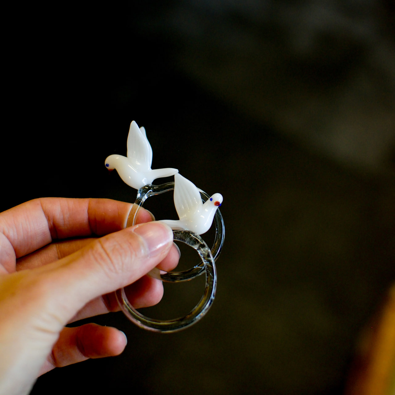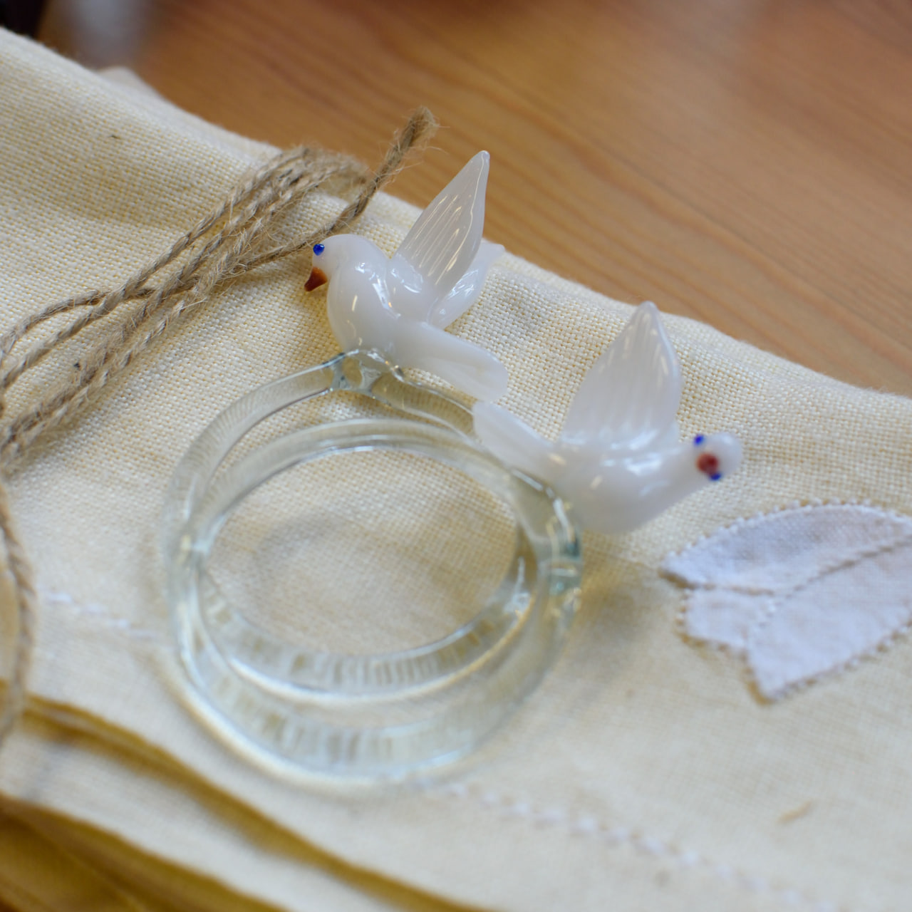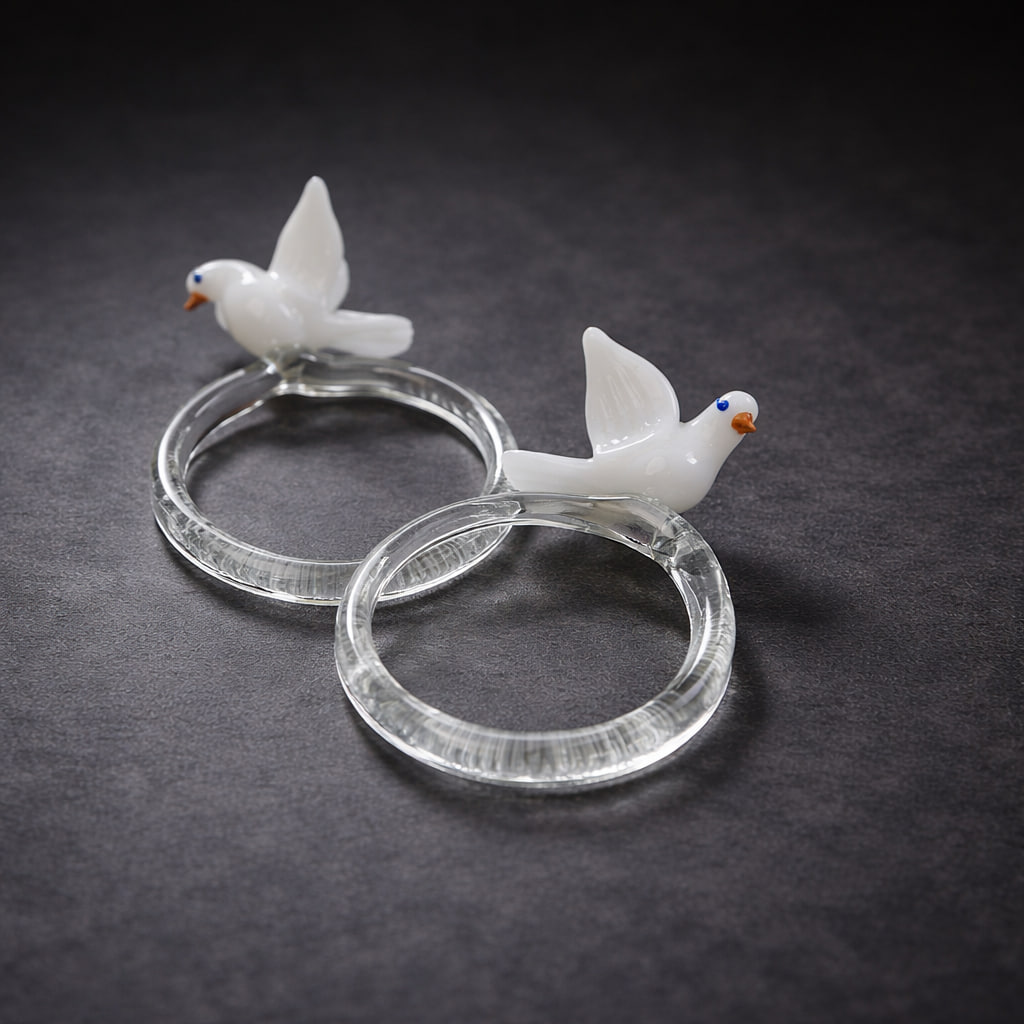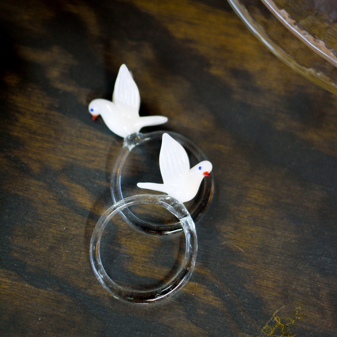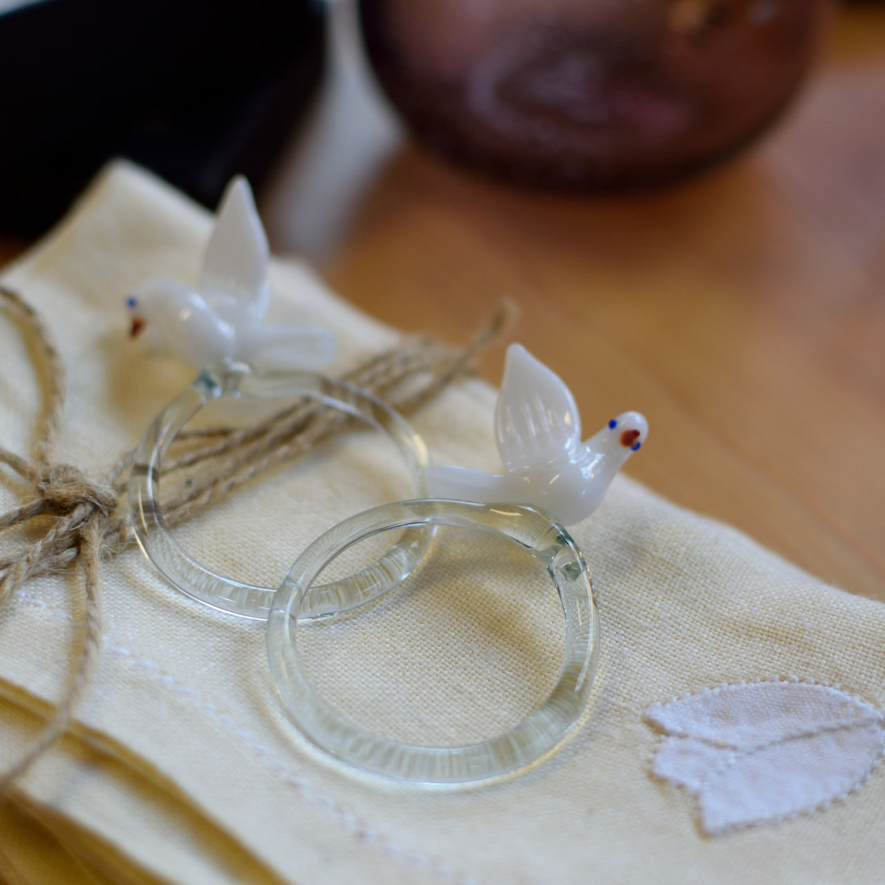 Varje ring har en diameter på ca 4 cm och pryds av en liten vit fågel med vackert detaljerade vingar, vars näbb och ögon är diskret färgsatta i glas. Kombinationen av klar glasring och den sirligt formade fågeln ger en elegant men lekfull känsla som förhöjer dukningen vid festliga tillfällen.