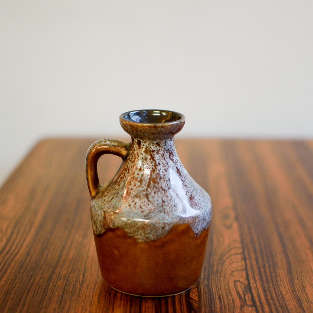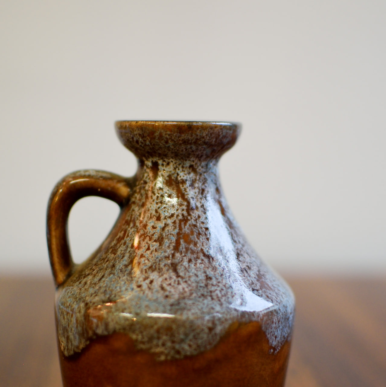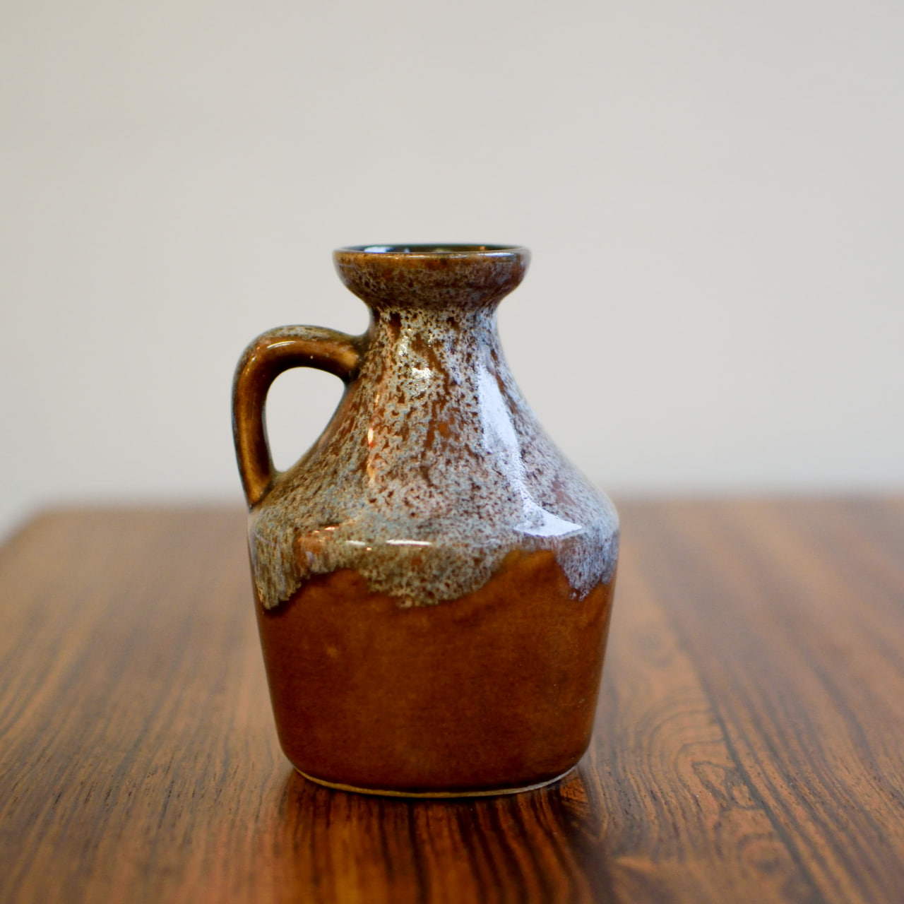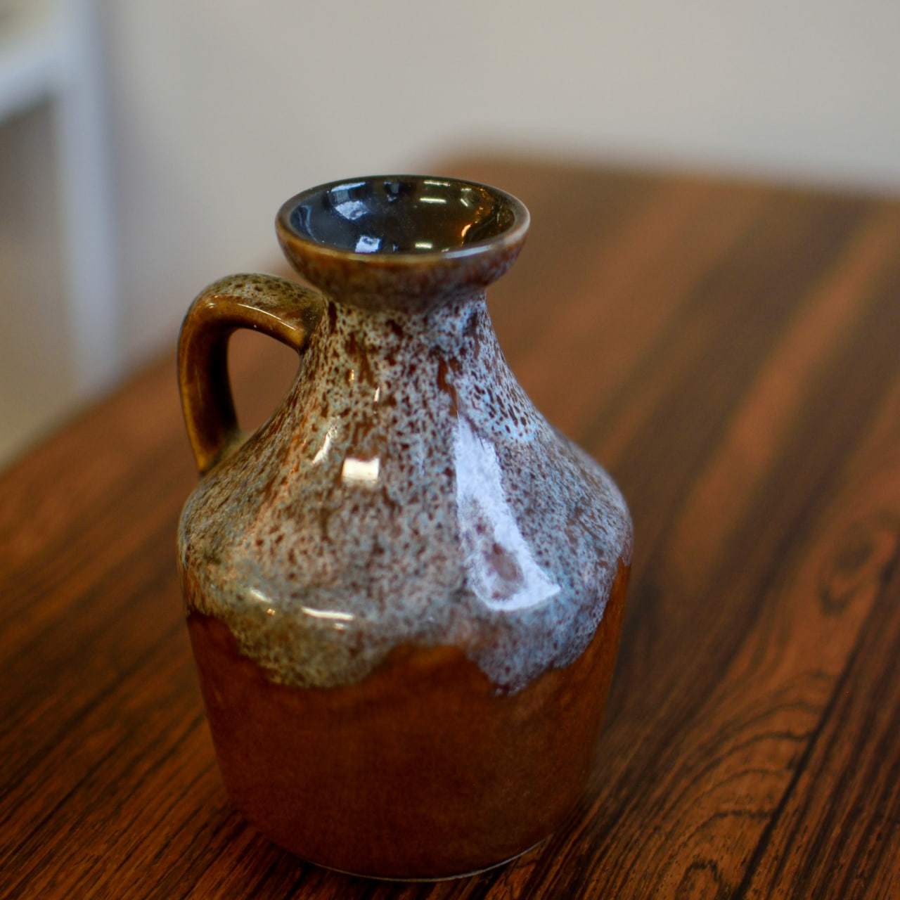 Dekorativt keramikkrus/vas med hänkel från Strehla Keramik, tillverkad i det forna Östtyskland (GDR) under 1960–70-talet. Denna modell, nr 999, är ett fint exempel på Strehla-fabrikens populära Fat Lava-design – med sin karaktäristiska rinnande glasyr och varma färgpalett.