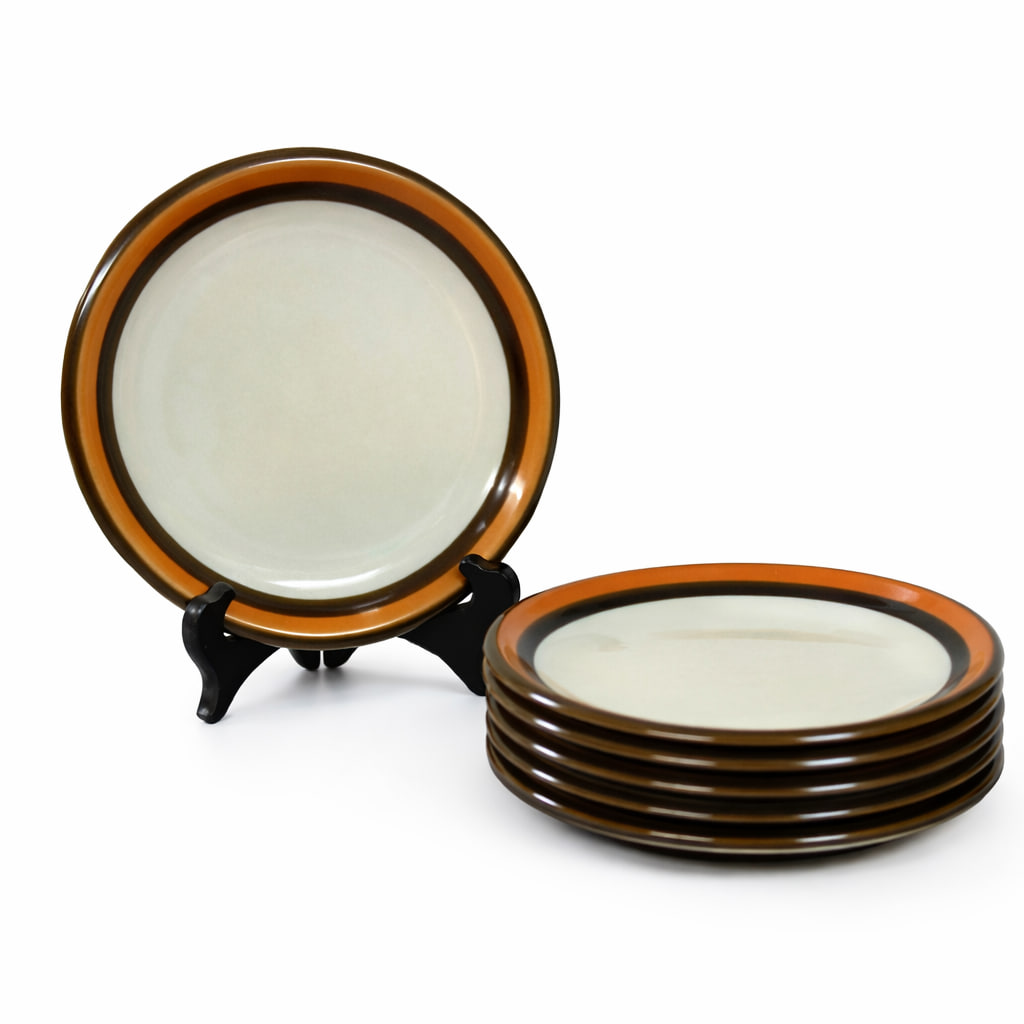 Tallriken har dekorativa färgband i brunt och orange som ramar in den ljusa mittdelen – ett formspråk som är både tidstypiskt och lätt att kombinera med annat porslin. Tallriken är tillverkad i slitstarkt porslin, avsett för vardagsbruk.