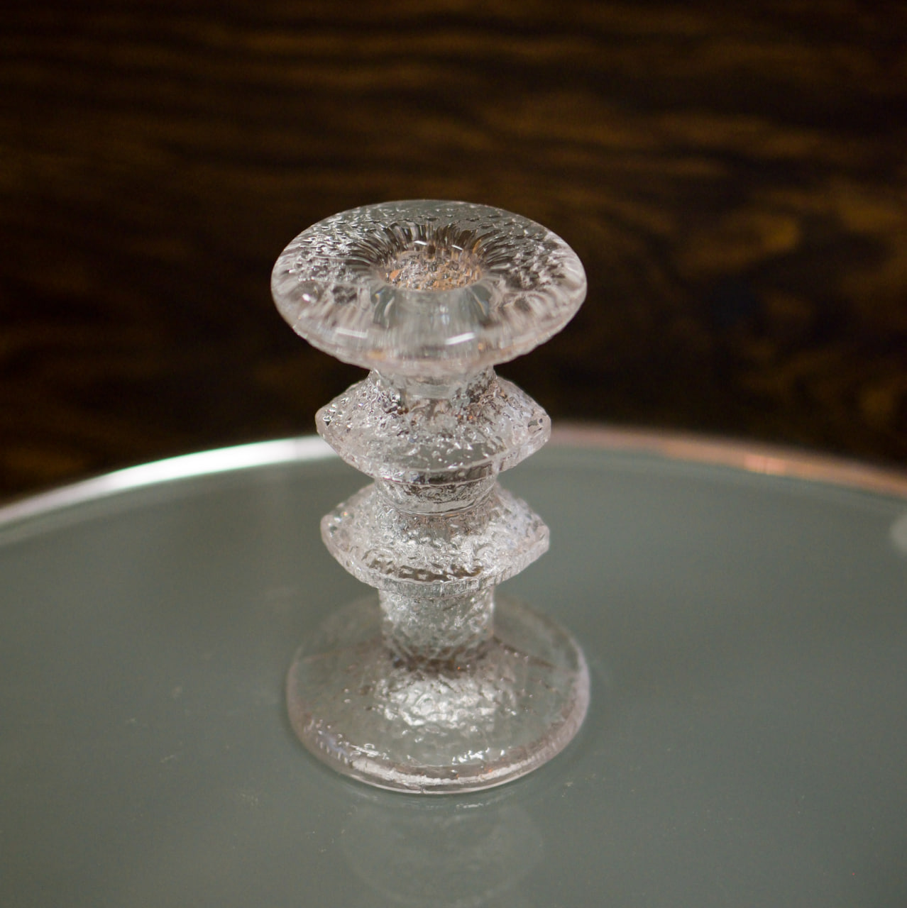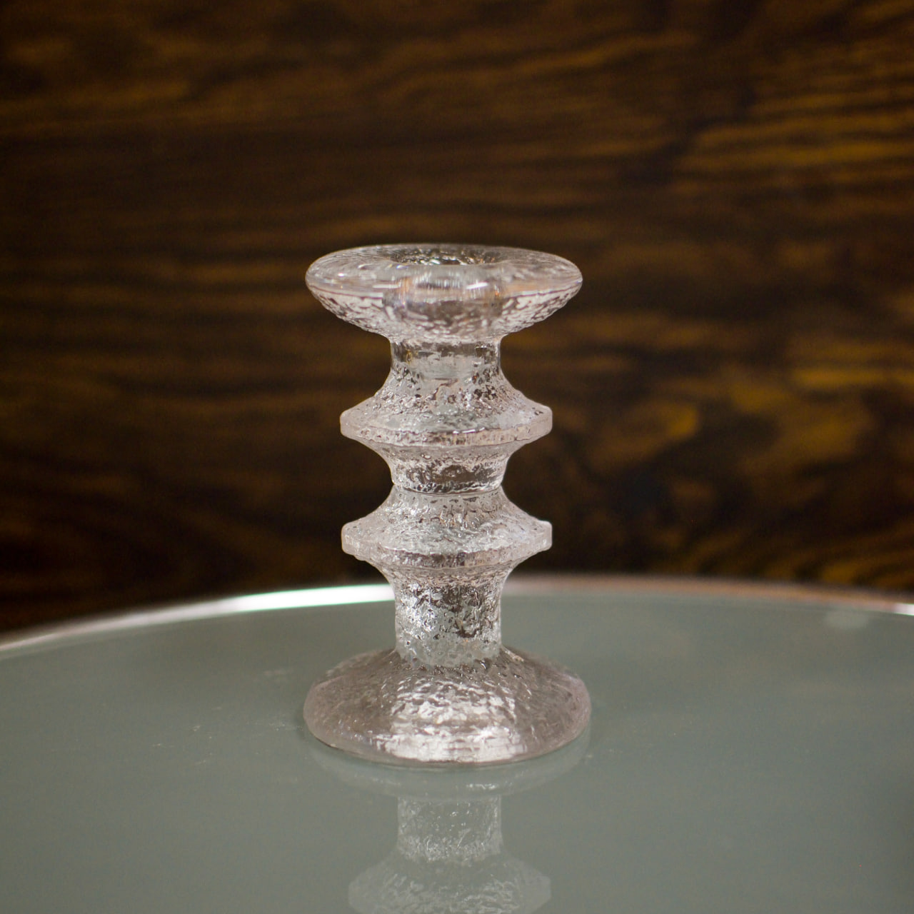 Elegant ljusstake i pressat glas ur den ikoniska serien “Festivo”, formgiven av Timo Sarpaneva för Iittala. Denna modell med två ringar har en höjd på 12 cm och är en av de mest välkända varianterna i serien. Ljusstakarna tillverkades i flera höjder – från en till åtta ringar – och kan med fördel kombineras för att skapa en levande, skulptural helhet.
