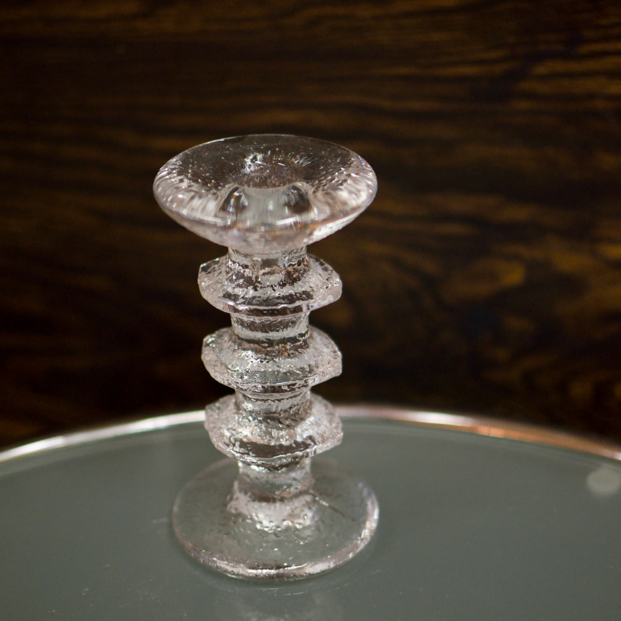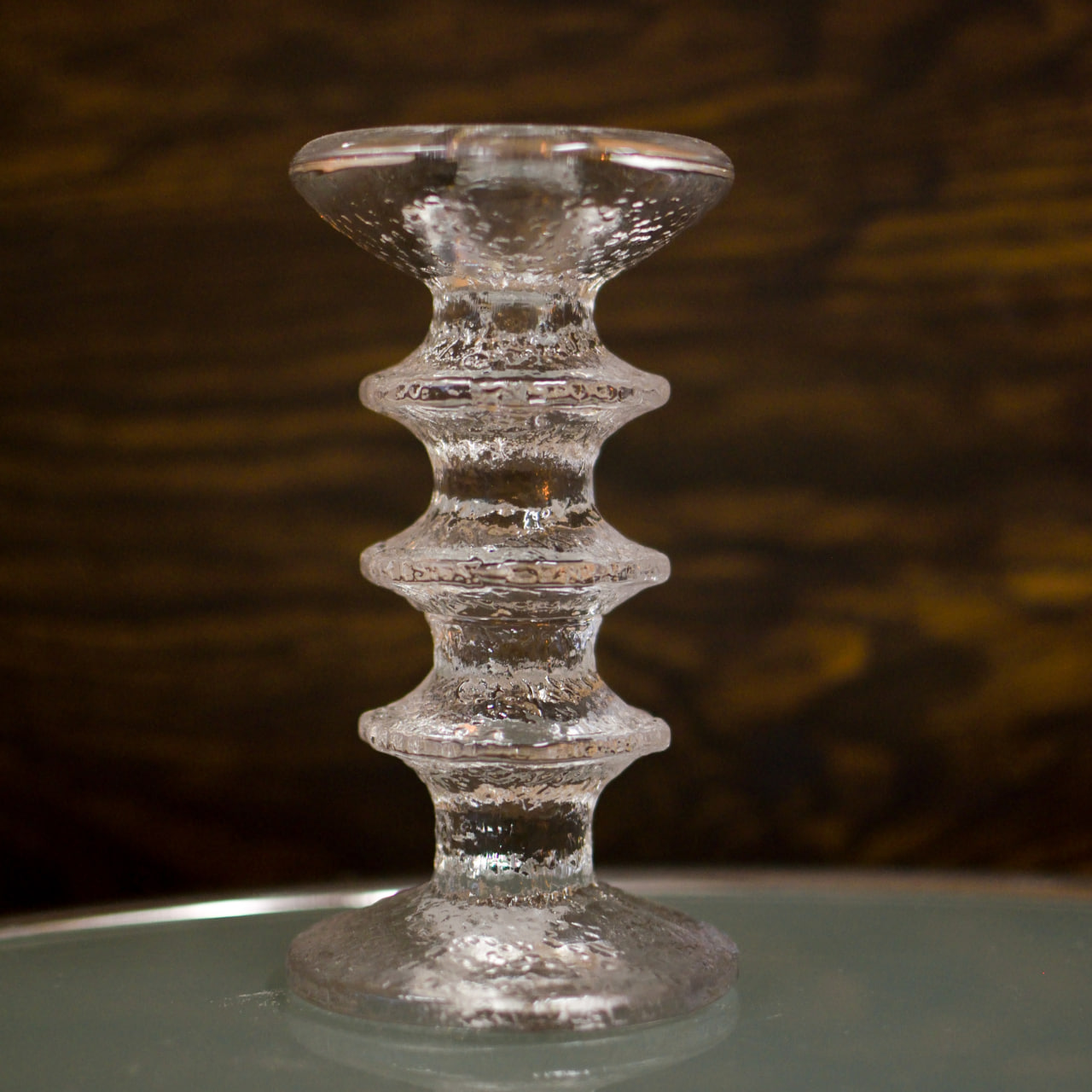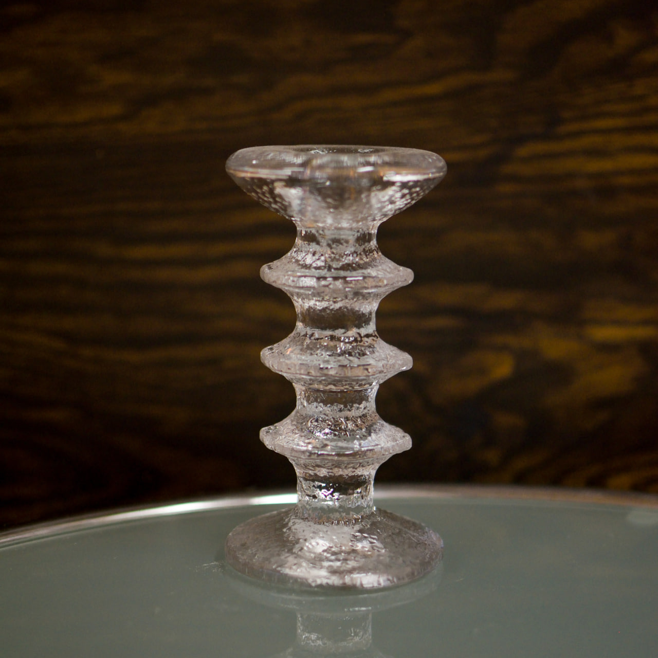 Ljusstake i pressat glas ur den ikoniska serien “Festivo”, designad av Timo Sarpaneva för Iittala. Denna variant med tre ringar har en höjd på 15 cm och kännetecknas av sin skulpturala form och frostade, isliknande glasstruktur – en hyllning till den nordiska naturen. Serien lanserades 1967 och har sedan dess blivit en symbol för finsk design och hantverksmässig perfektion.