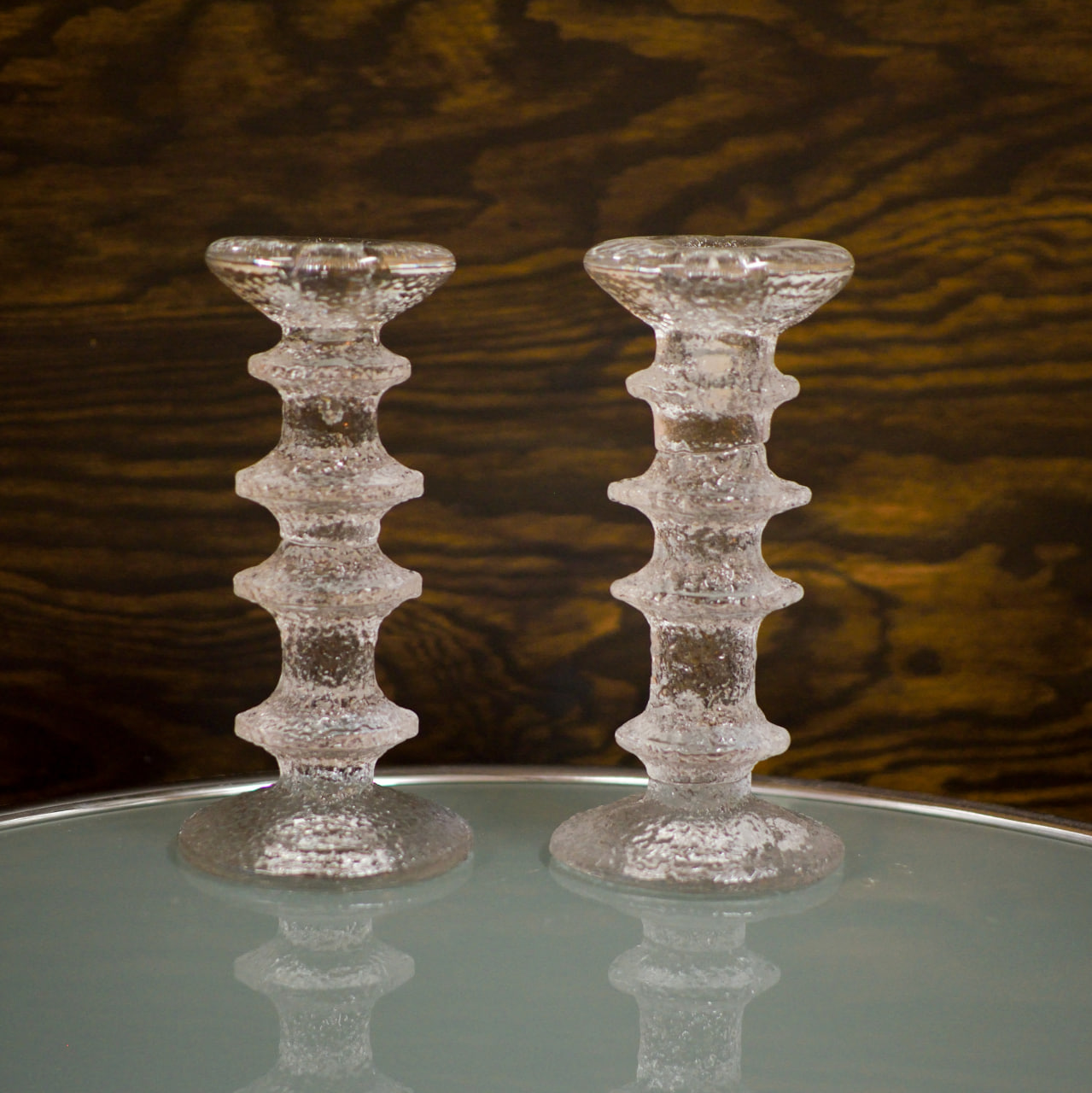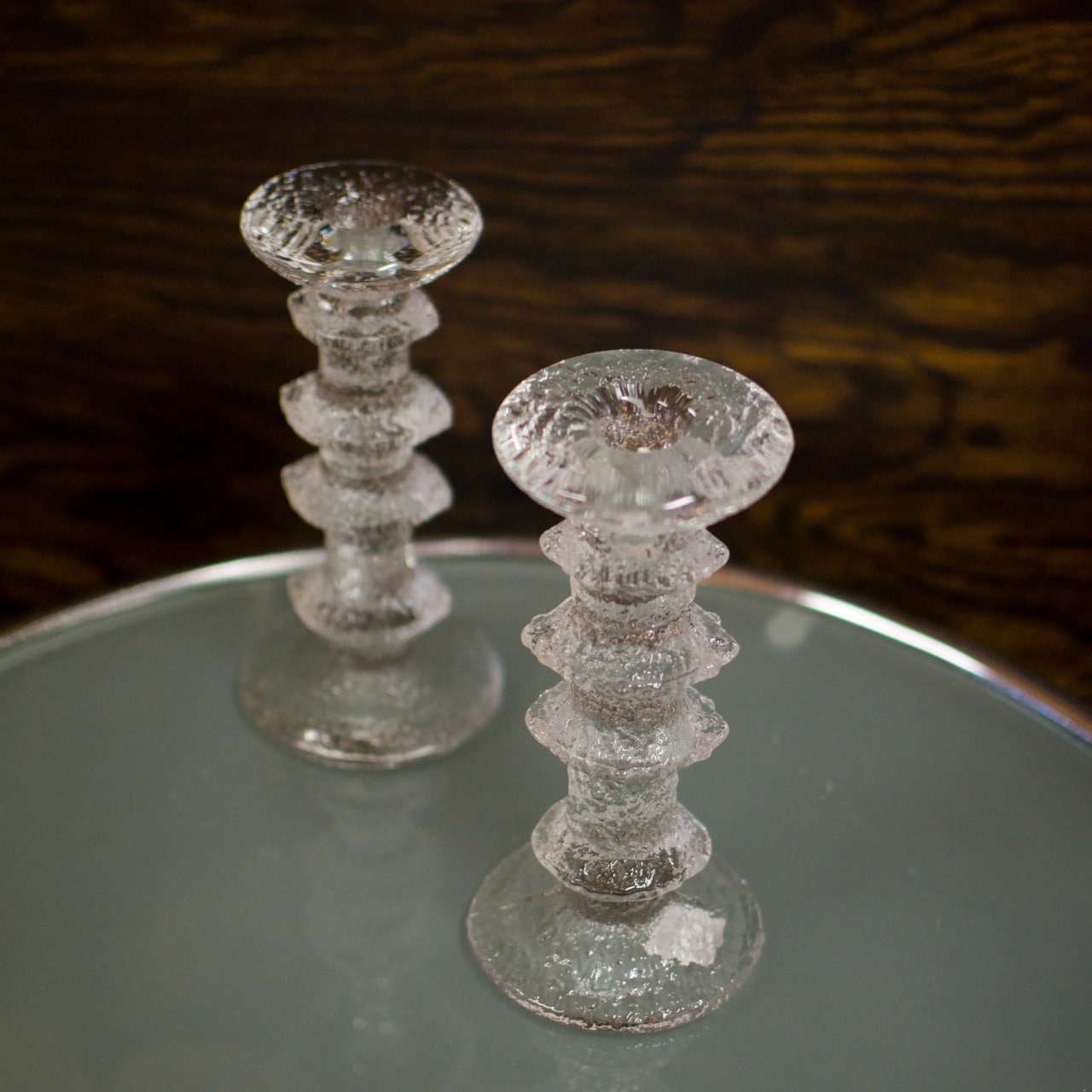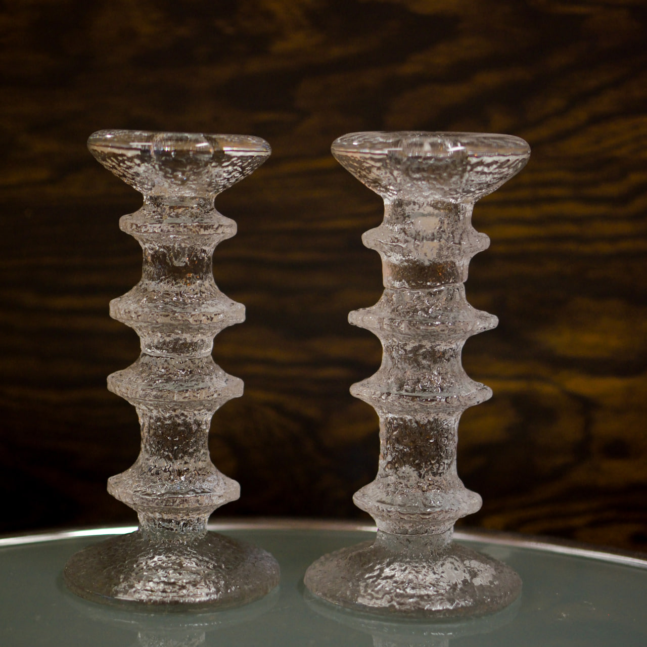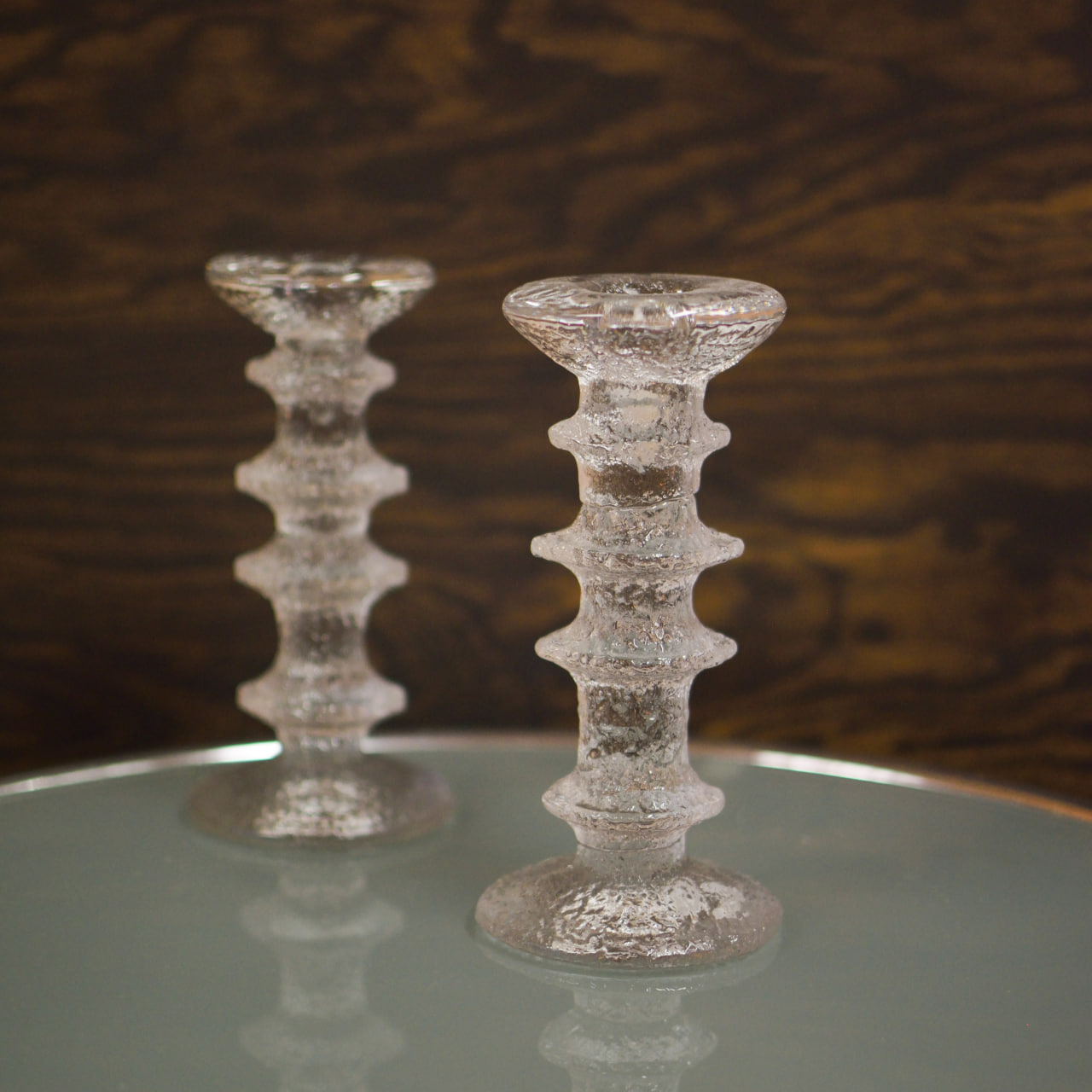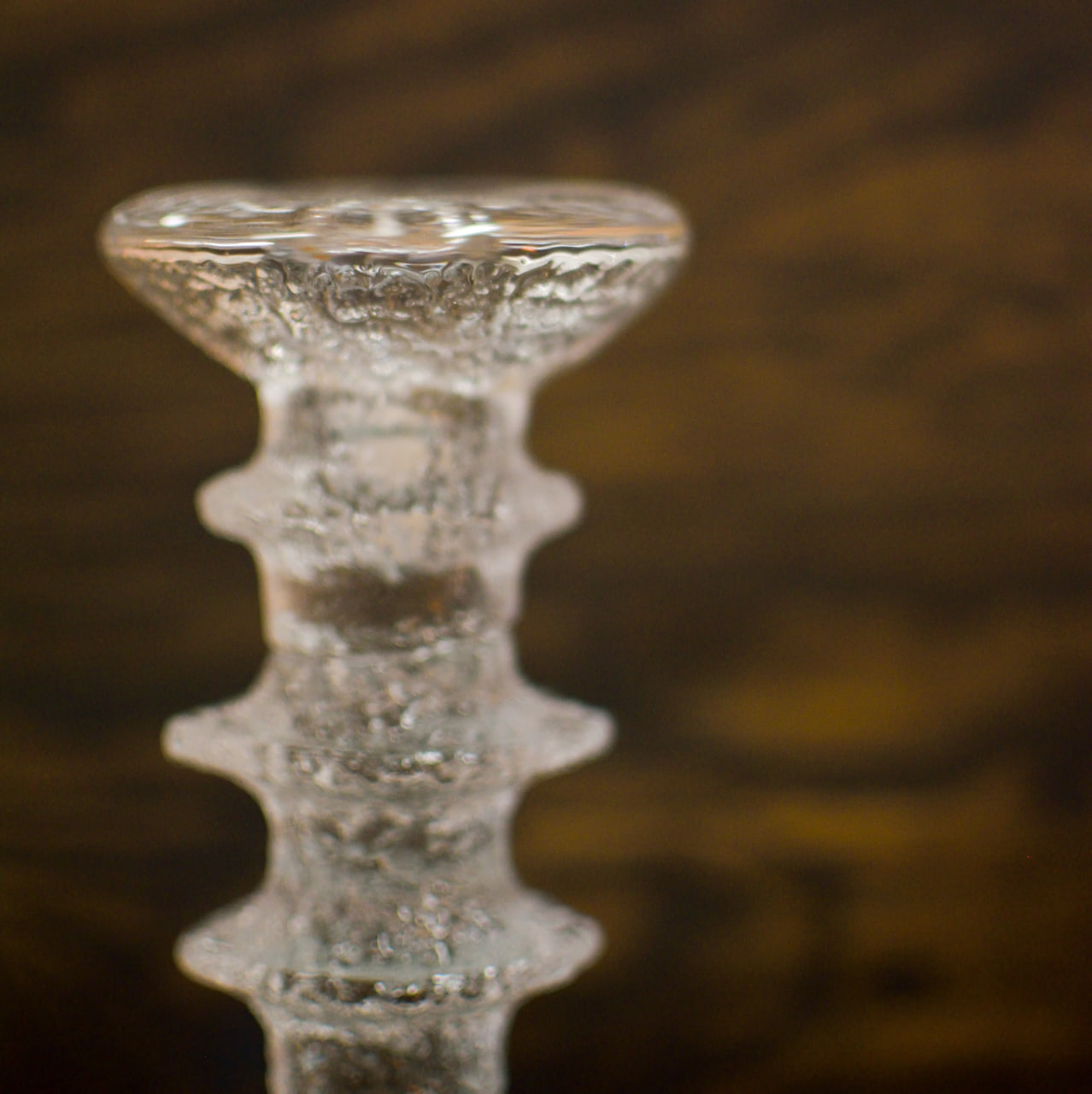 Ljusstake i pressat glas ur den legendariska serien “Festivo”, designad av Timo Sarpaneva för Iittala. Denna modell med fyra ringar har en höjd på 18,5 cm och utmärker sig genom sitt skulpturala uttryck och sin karakteristiska, frostade glasstruktur som reflekterar ljuset likt is. Serien lanserades 1967 och har sedan dess blivit en ikon inom finsk och nordisk design.