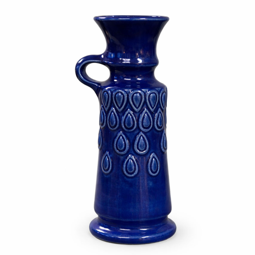 Dekorativ vas från tyska Jasba, modell N2071320, med en höjd på 20,5 cm. Vasen är tillverkad i glaserad keramik och har en djup, intensiv blå färg som ger ett starkt visuellt uttryck. Den reliefdekorerade ytan med droppformade mönster skapar liv och struktur och är typisk för Jasbas formspråk under mitten av 1900-talet.