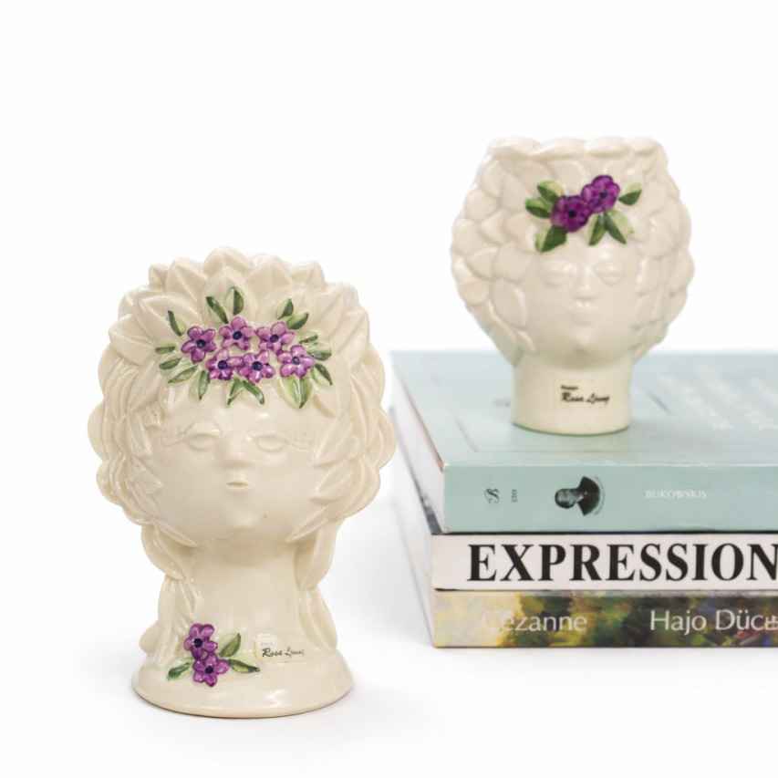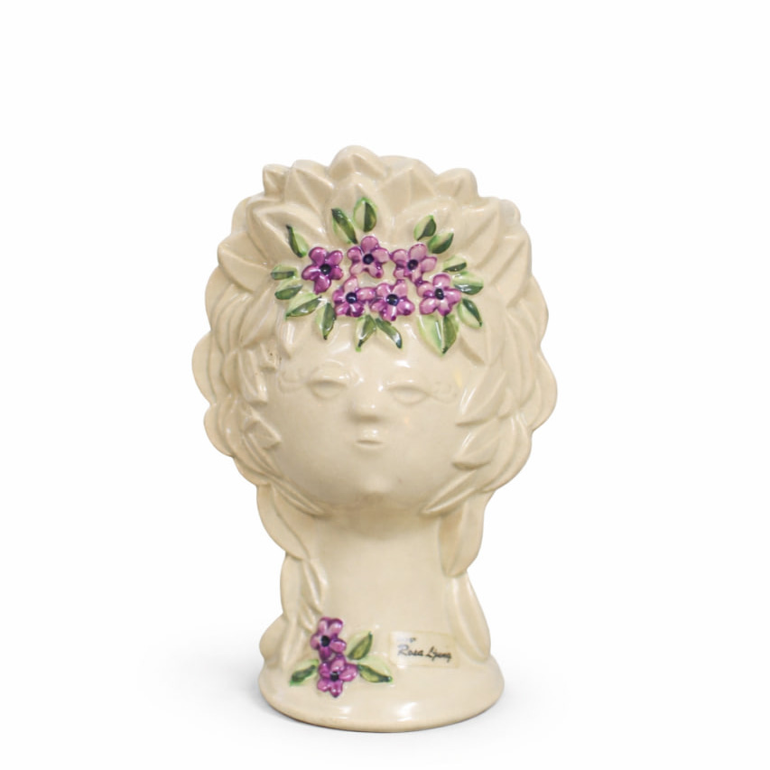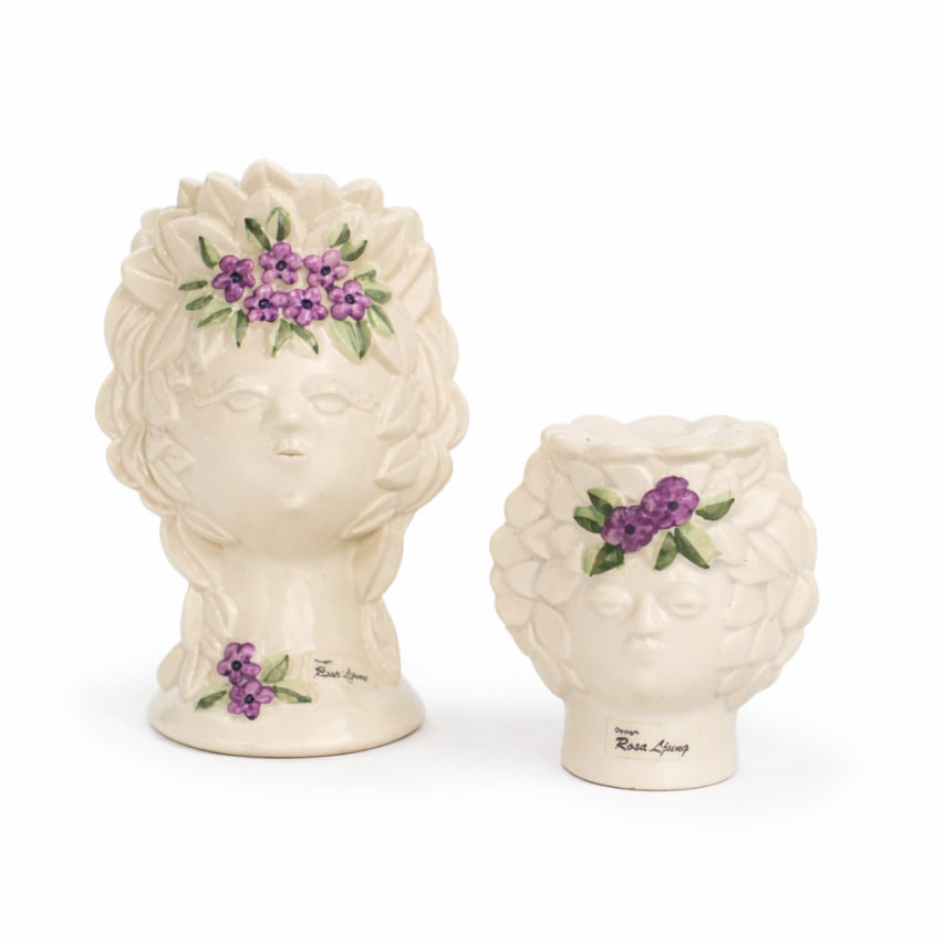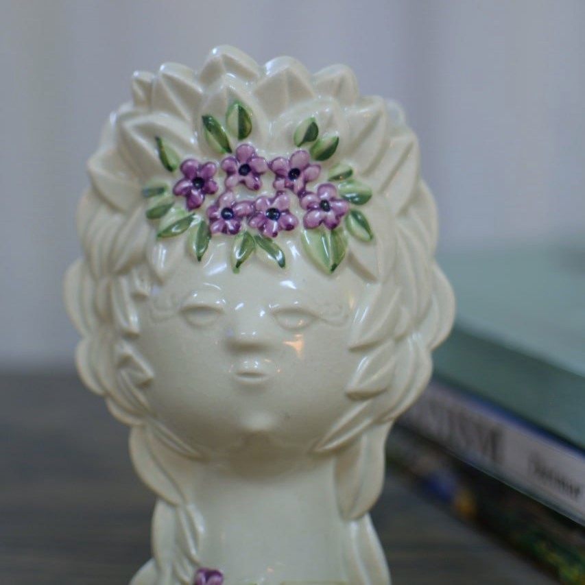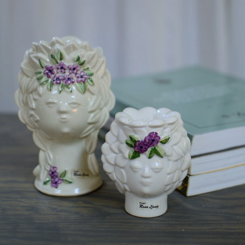 Charmigt set bestående av en vas/kruka och en liten ljusstake i glaserad keramik, formgivna av Rosa Ljung för Deco i Helsingborg. Vas/krukan har ett karakteristiskt ansiktsmotiv med mjuka drag och håret dekorerat med handmålade blommor i lila och grönt – ett formspråk som är typiskt för Rosa Ljungs dekorativa och lekfulla stil.