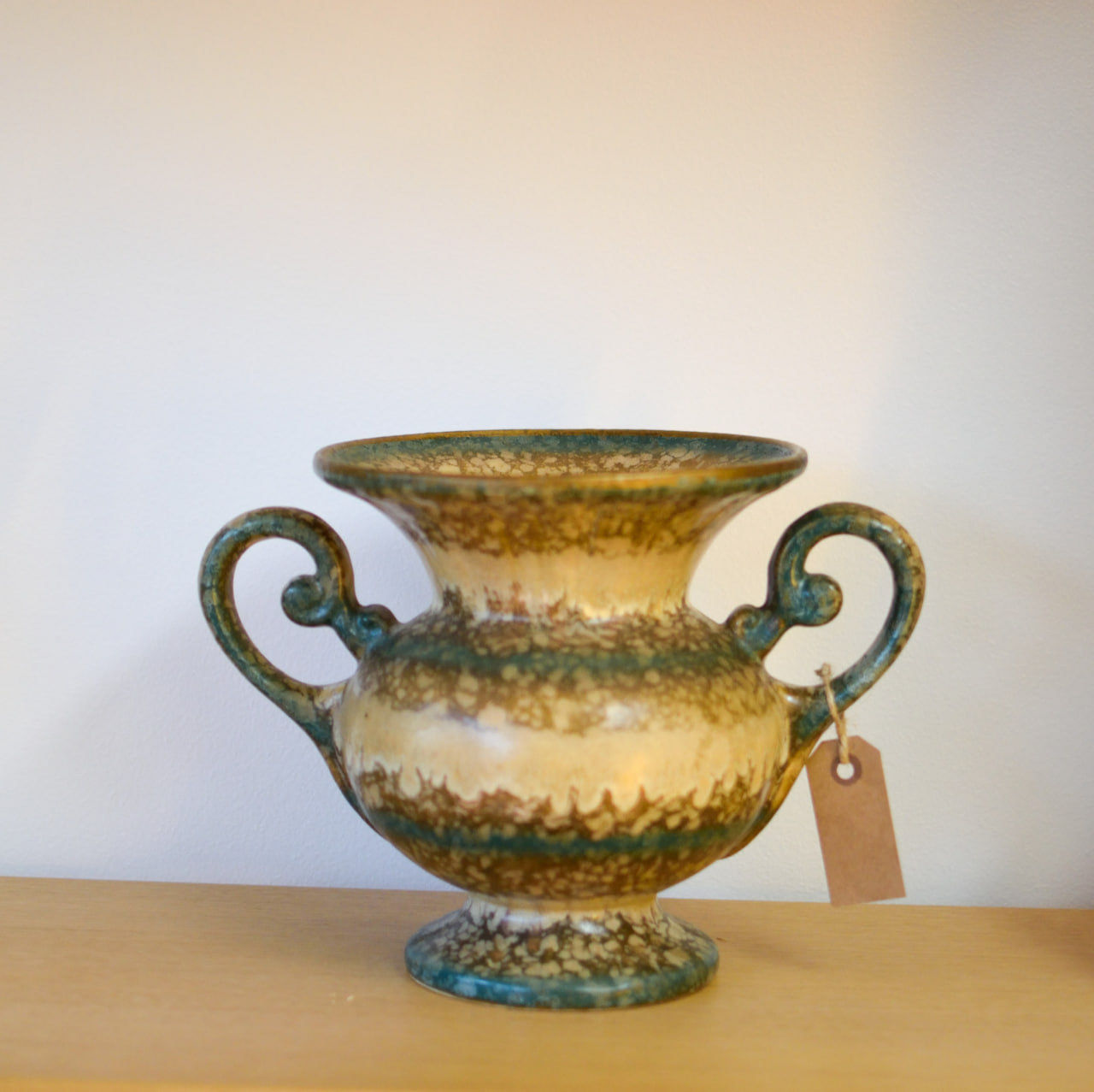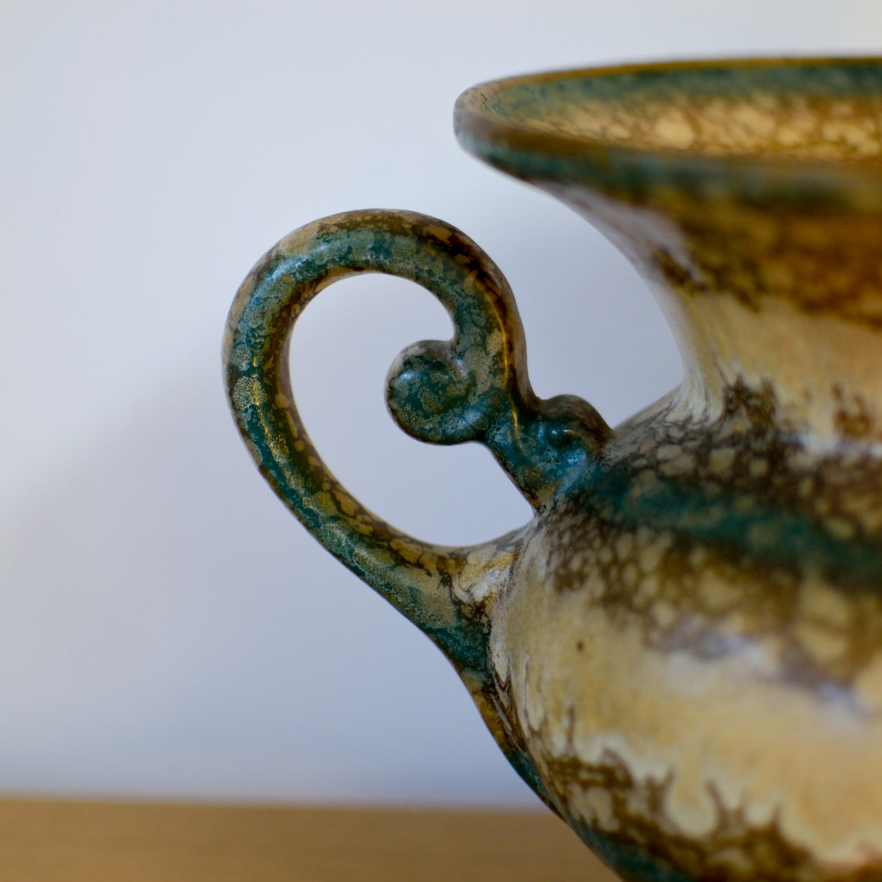 Vacker vintage vas i glaserad keramik med dekorativa dubbla handtag och en klassisk, amforainspirerad form. Den levande glasyrytan går i nyanser av grönt, beige och brunt, med ett vackert krackelerat mönster som ger djup och karaktär.